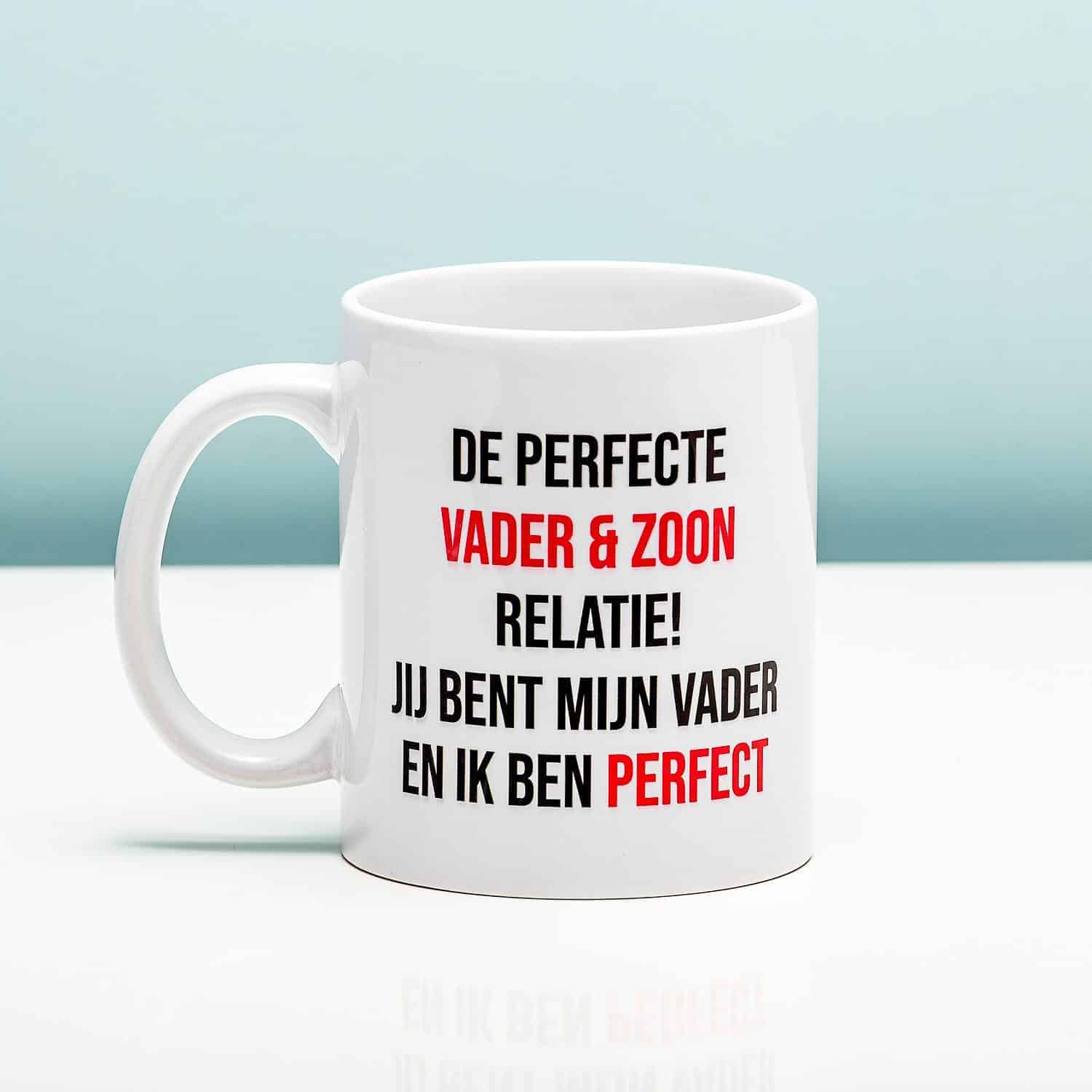 Je vader is je beste vriend. Als kind kijk je tegen hem op, later kijken jullie samen voetbal en is hij degene die je leert om te klussen. Jullie relatie is perfect. En dat kun je bekronen met de Perfecte vader en zoon relatie mok. Op deze grappig mok staat de tekst: de perfecte vader & zoon relatie. Jij bent mijn vader en ik ben perfect. Dan is dat ook weer duidelijk! Deze beker is een leuk cadeau voor bijvoorbeeld Vaderdag of als verjaardagscadeau.