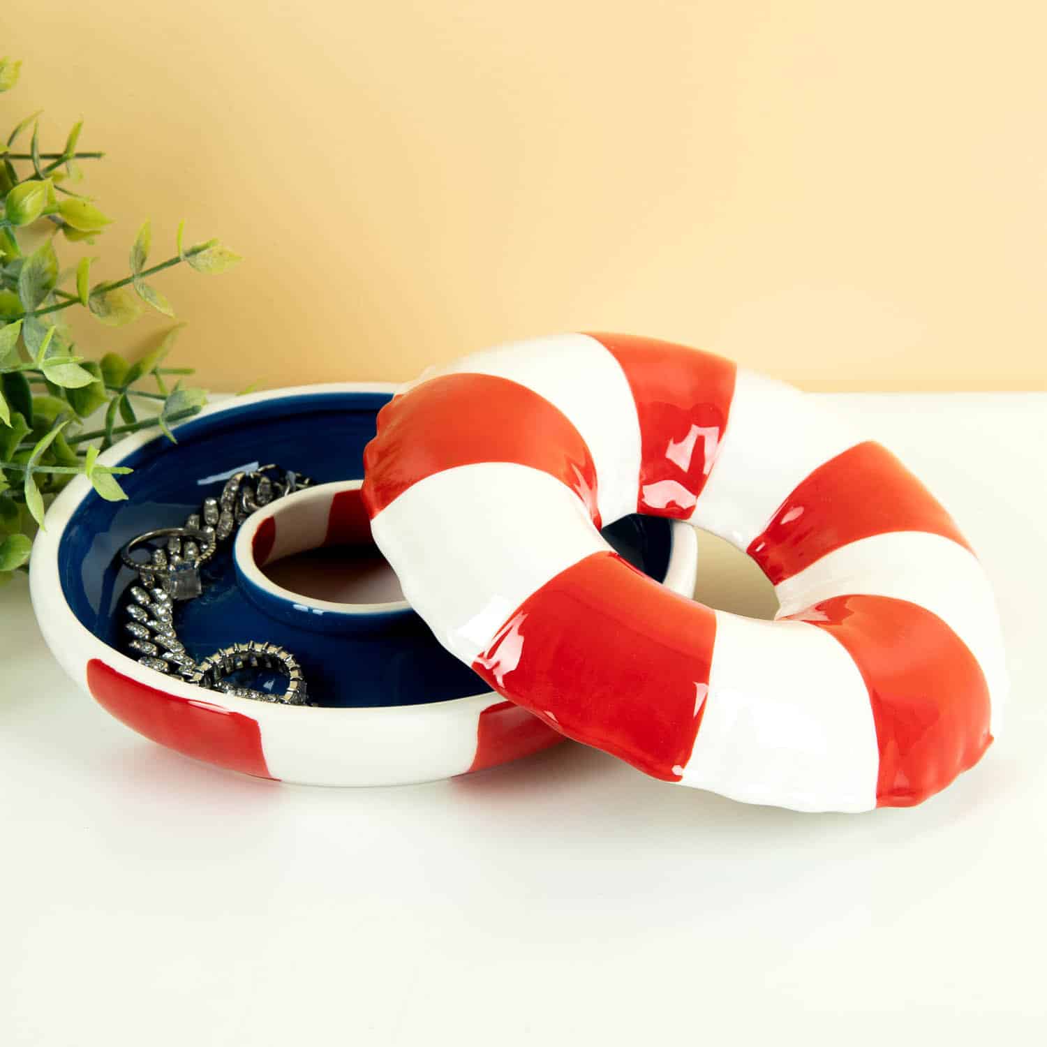 Kan je je favoriete oorbellen niet vinden? Geen nood! Het Reddingsboei sieradenschaaltje van Bitten is altijd dicht in de buurt. Niet om je uit het water te hijsen, maar dit is waarschijnlijk de plek waar je je oorbellen vindt. Dit grappige sieradenschaaltje lijkt op een reddingsboei en staat super leuk op je nachtkastje. Naast ringen en oorbellen is het ook een leuk bakje om bijvoorbeeld snoepjes in te serveren.