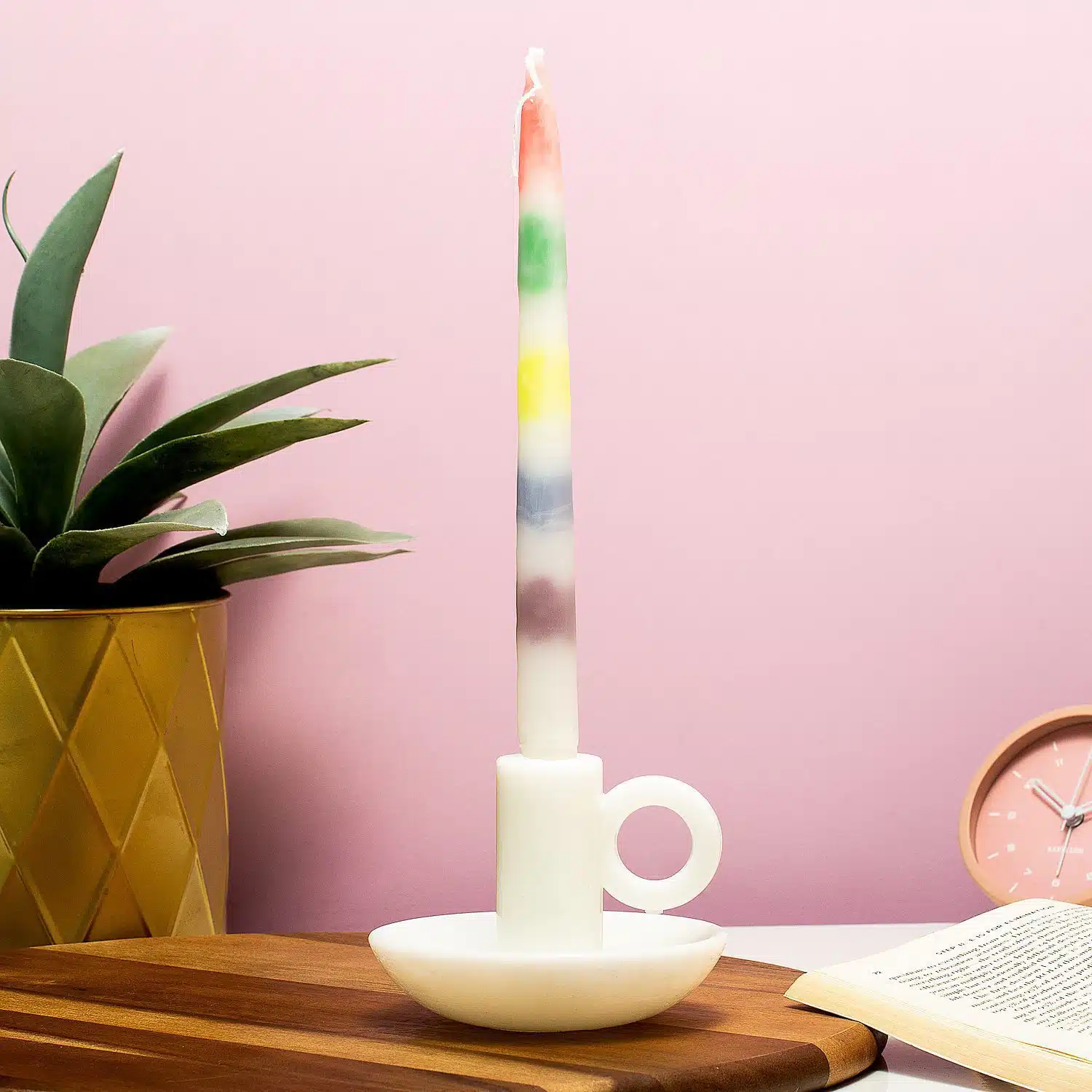 Altijd al willen weten hoe een eenhoorn eruit ziet als hij smelt? Nou, een beetje als de Regenboog druipkaars en kandelaar van Bitten! Deze kaars heeft aan de binnenkant allemaal vrolijke kleuren die over elkaar buitelen als hij smelt. Maar dat is niet het enige bijzondere aan dit setje. De kandelaar is namelijk ook gemaakt van paraffine. Hij kan dus smelten, als je dat wilt. Zo niet, vervang de kaars dan op tijd door een ander kaars.