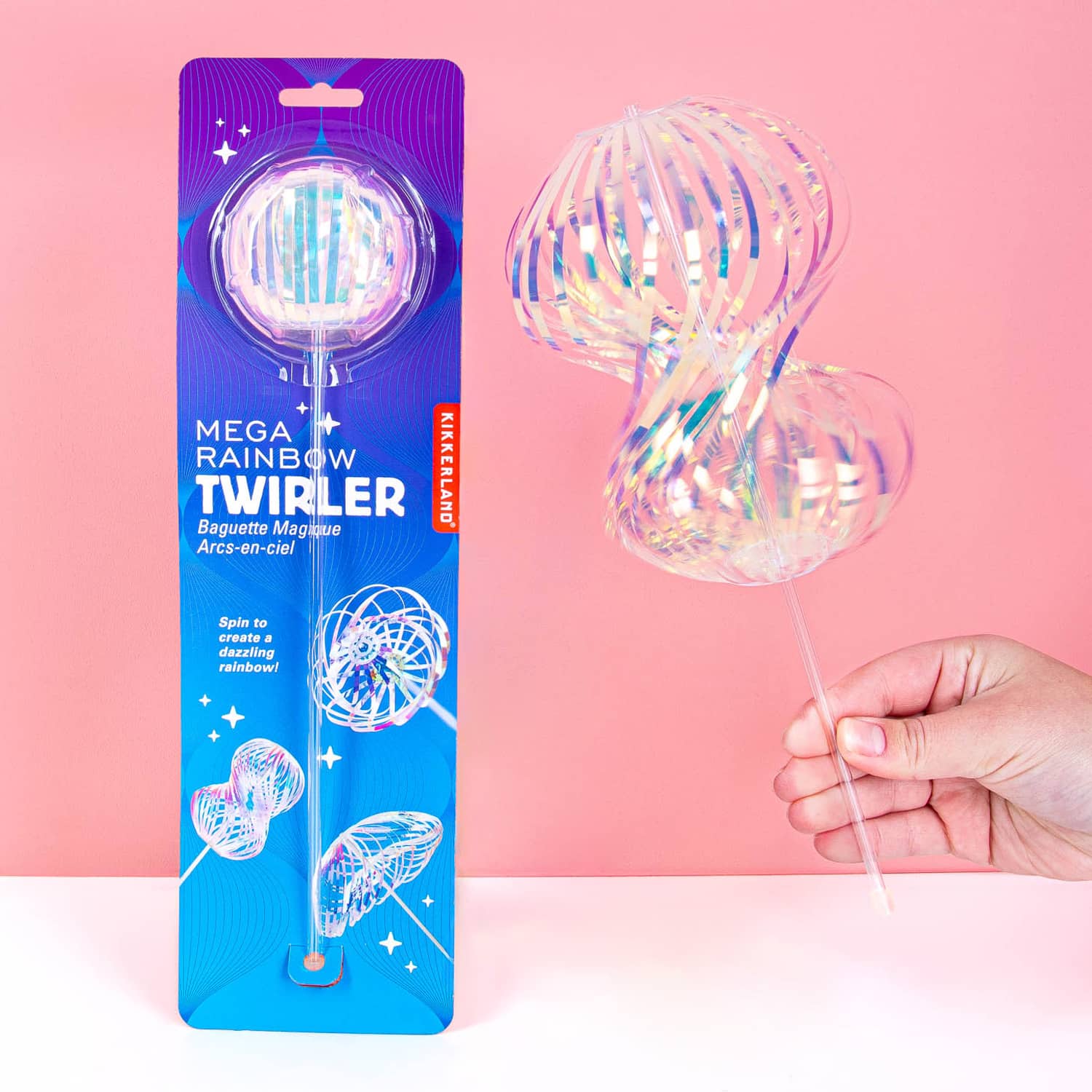 Is het een regenboog? Is het een zeepbel? Nee, dat is het niet: het is de Regenboog spinner van Kikkerland! We snappen je verwarring want zelf zijn wij ook nog steeds onder de indruk van dit bijzondere stukje speelgoed. De Regenboog spinner is een stokje met dunne sliertjes die een holografisch effect geven. Als je het stokje laat draaien, dan vormen de sliertjes een soort van zeepbel met regenboogkleuren erin. Doordat er verschillende figuren te maken zijn, is dit een fijne bezigheidstherapie. Bijvoorbeeld voor de kids op een saai feestje van de grootouders. Hebben ze ook gelijk een publiek dat ze makkelijk kunnen foppen.