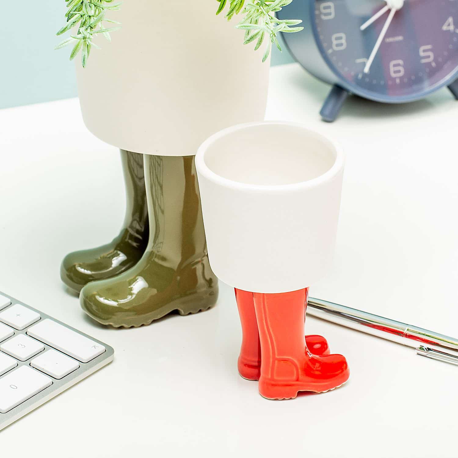 Als je dol bent op originele woonaccessoires, dan is de Regenlaarzen bloempot van Bitten jou op het lijf geschreven. Deze bloempot is gemaakt van wit porselein, maar heeft een opvallend detail: twee opvallende regenlaarzen aan de onderkant. De laarzen zijn met de hand gemaakt en plaatsen de witte bloempot op een bijzonder voetstuk. Je kunt kiezen uit rode of groene laarzen. Leverbaar in twee formaten.