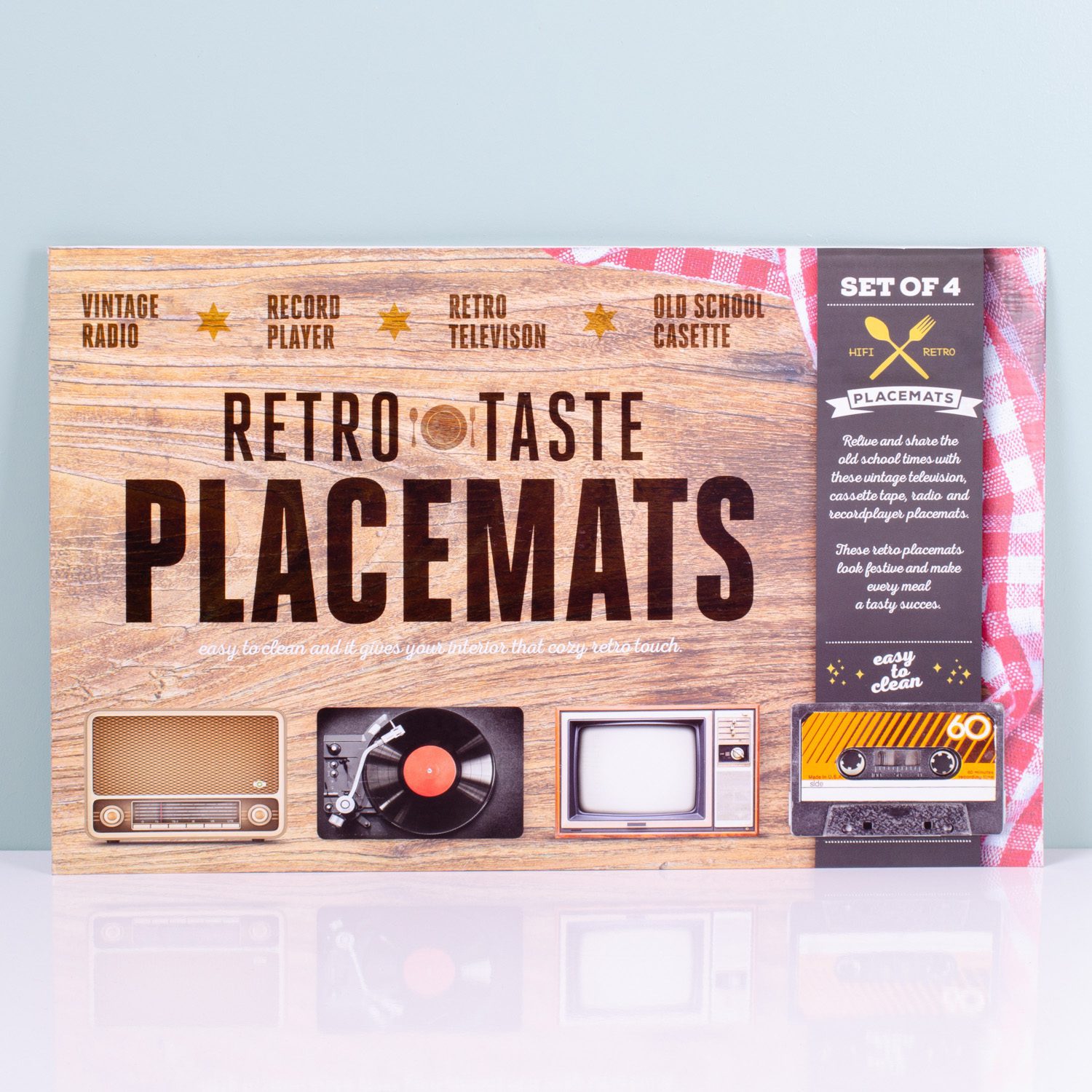 Ben jij dol op spullen met een vintage look? Dan passen de Retro placemats (set van 4) van MikaMax zeker in jouw huis. Deze placemats beschermen niet alleen je tafel tegen kringen en krassen, maar halen ook je nostalgische gevoelens naar boven. De placemats hebben namelijk het uiterlijk van allemaal retro gebruiksvoorwerpen: een oude tv, radio, een cassettebandje en een platenspeler.
