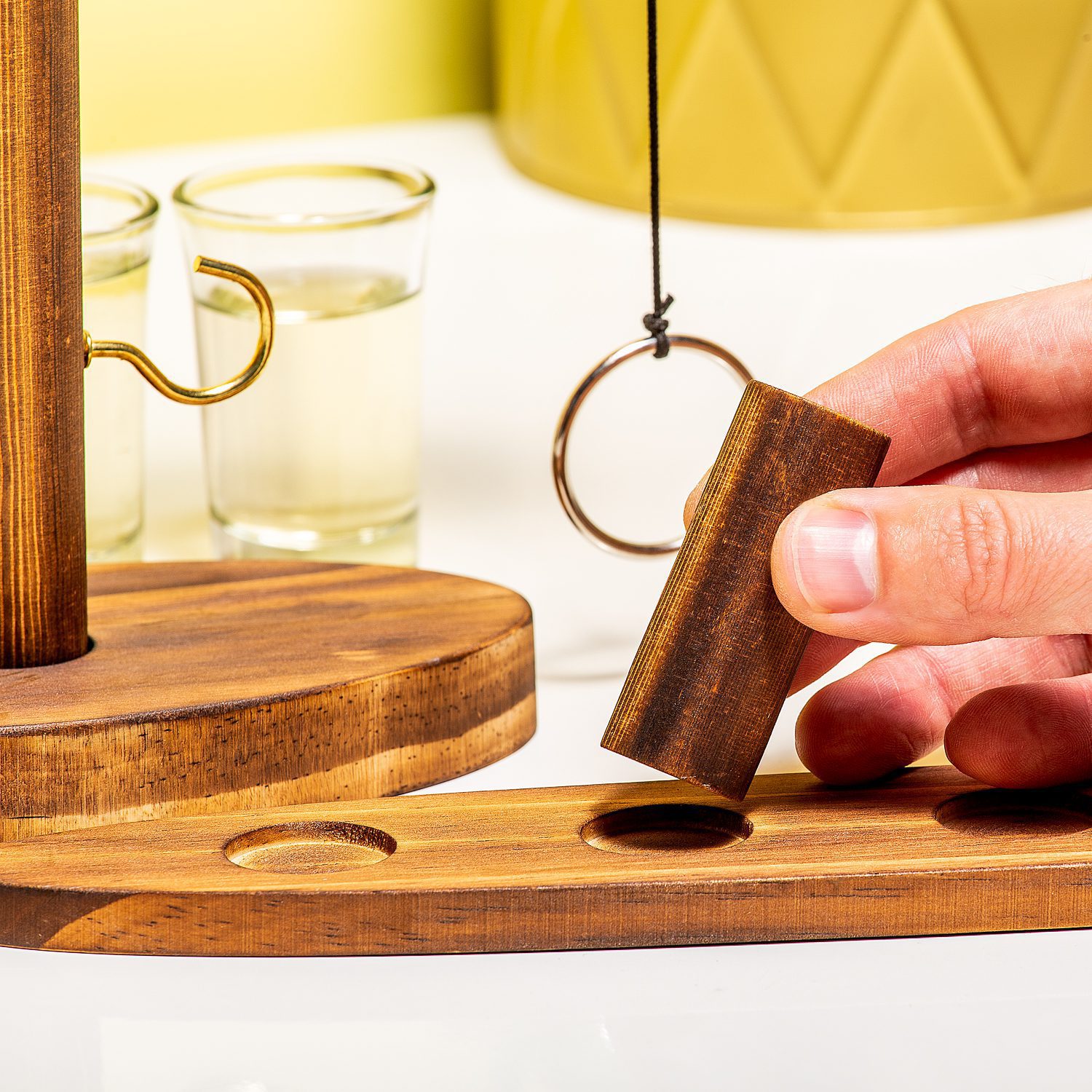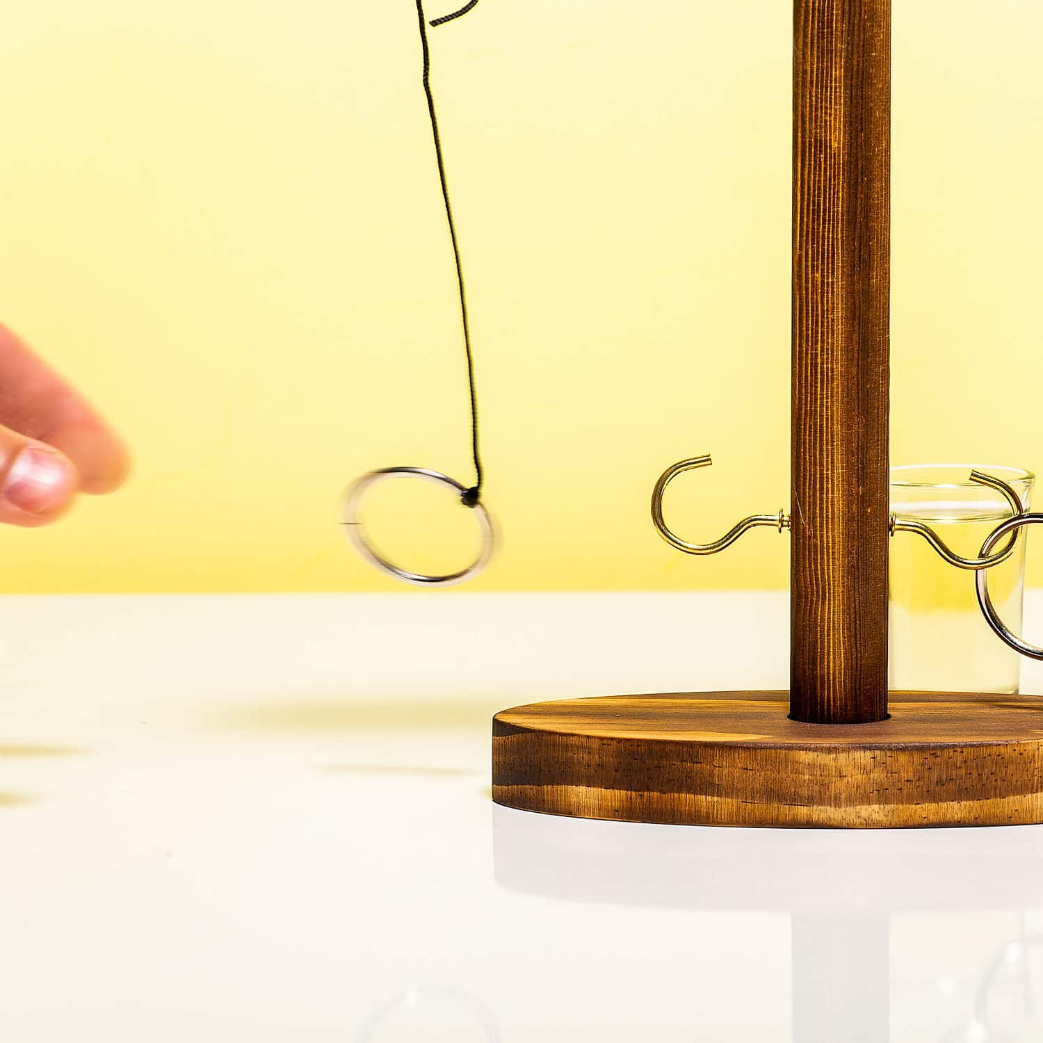 Ringwerpen nieuwe stijl: met een lekker compact spelletje én drank binnen handbereik. Het Ringwerp drankspelletje is een perfect item om mee te nemen op vakantie, of om te gebruiken tijdens feestjes. Het is de bedoeling dat je de ring om het haakje werpt. Inclusief twee shotglaasjes.