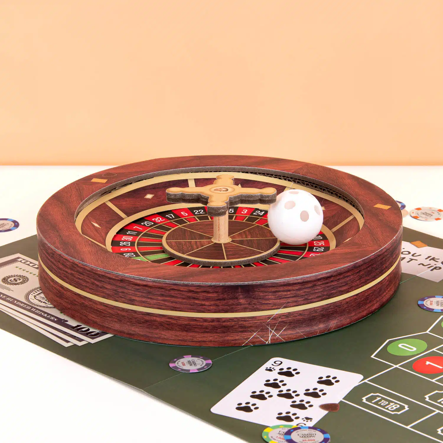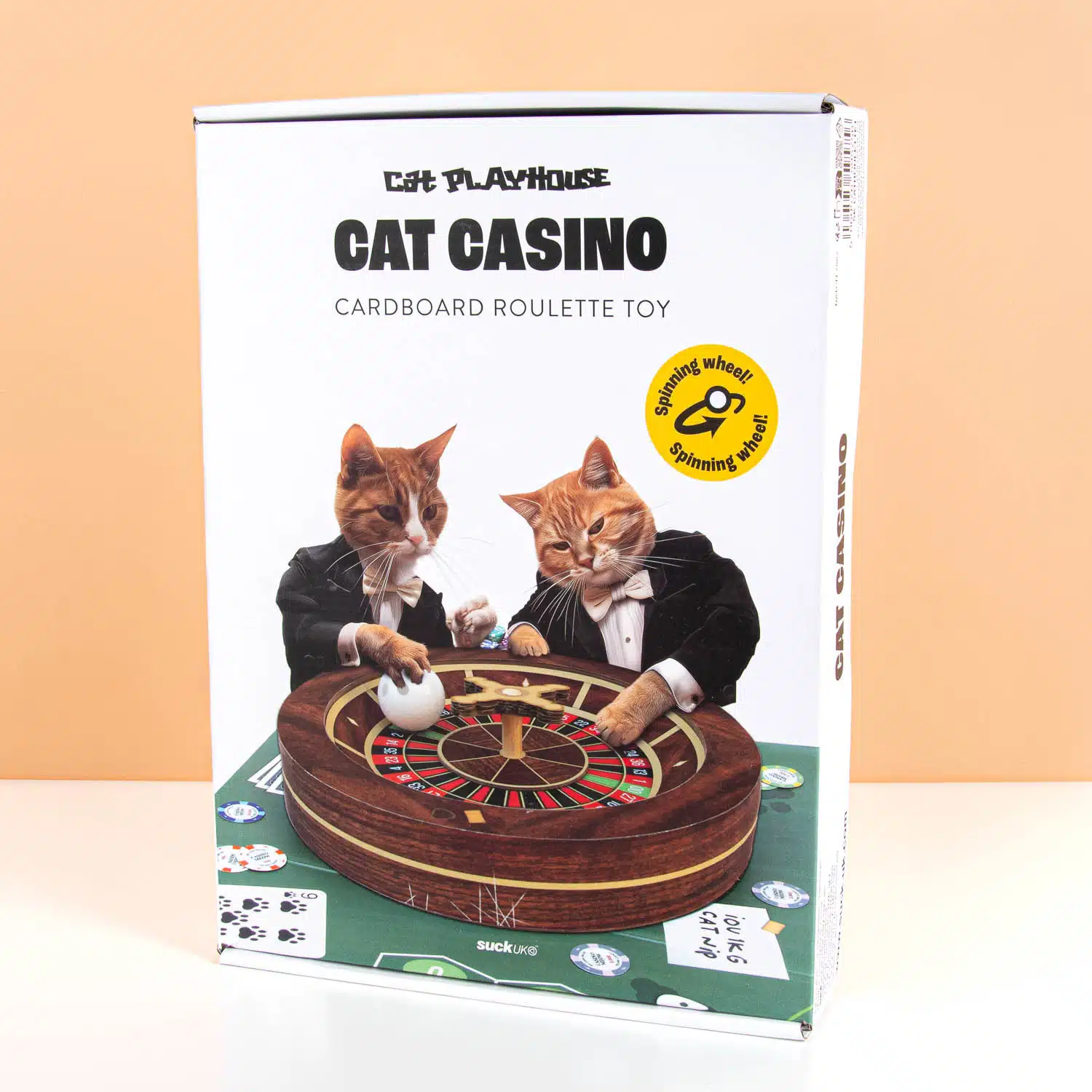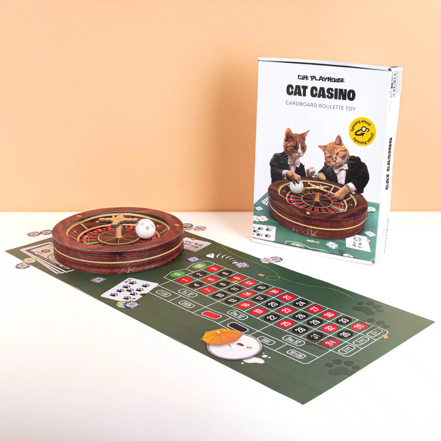 Wil je dat je kat je nieuwe bank met rust laat en lekker gaat spelen met iets wat echt voor hem of haar is? Met de Roulette krabtafel voor katten van Suck UK is hij niet meer weg te slaan uit het casino! Deze grappige roulettetafel is gemaakt van karton en speciaal bestemd voor scherpe nagels (en grappige filmpjes). Het wiel draait echt en in het balletje zit een belletje om je kat te entertainen. Om het helemaal af te maken krijg je ook een opvouwbare mat en kartonnen chips.