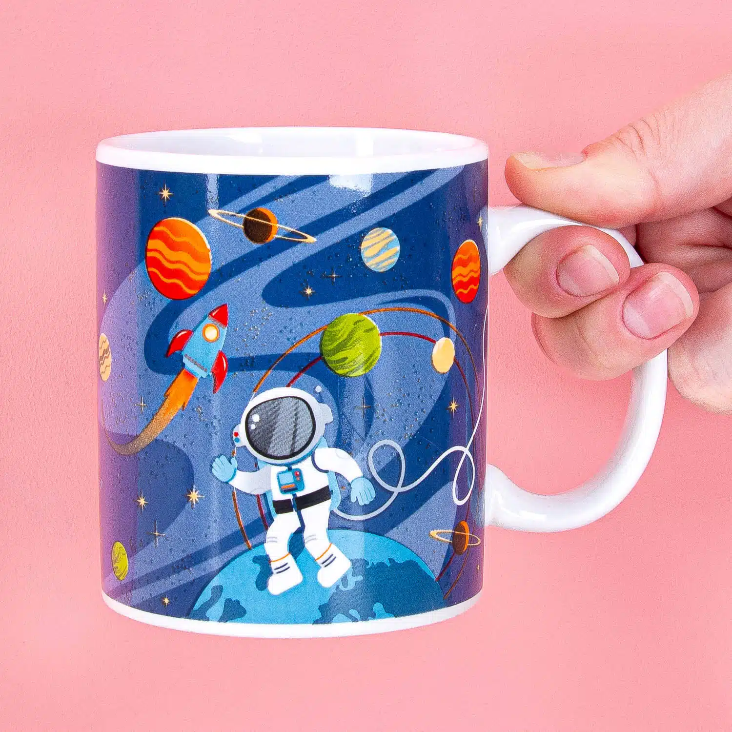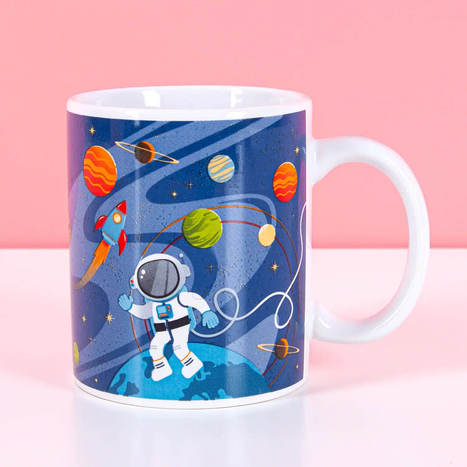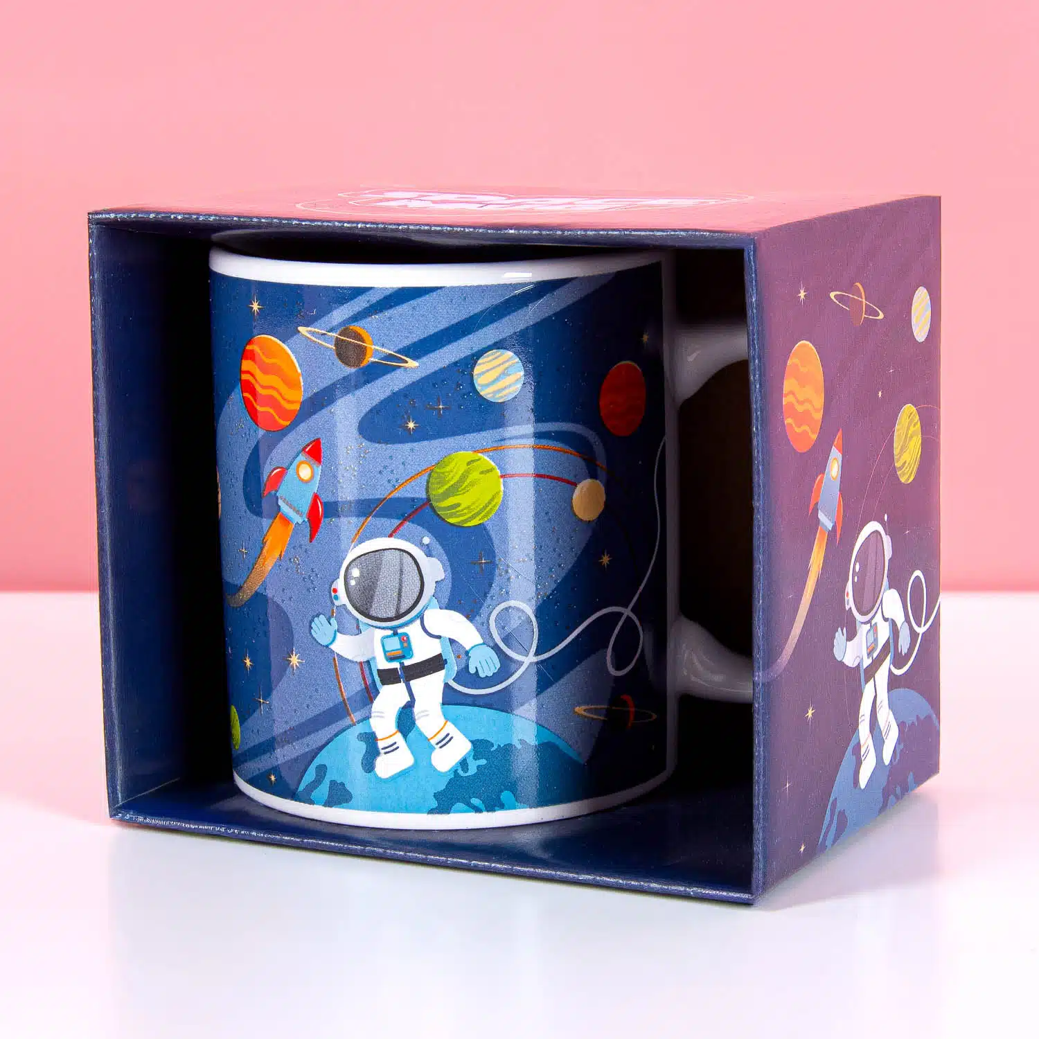 Verras je astronaut in de dop met deze leuke Ruimte mok. De beker heeft een ruimtethema en er zweeft een astronaut tussen de planeten en raketten.