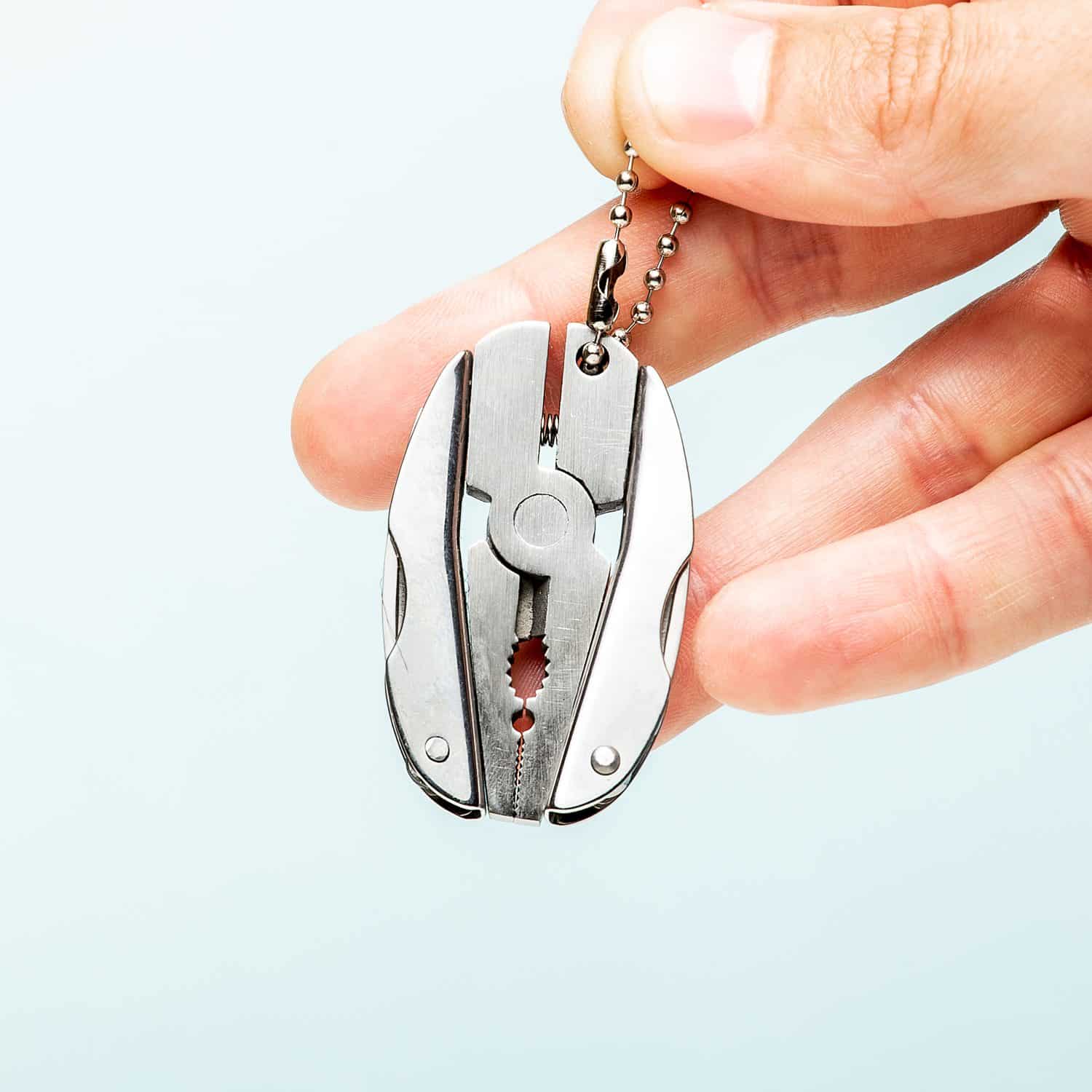 Vouw je de multitool open dan kom je als eerste een tang tegen. Handig als je opeens een roestige spijker uit het kozijn wilt trekken. Verder heeft ‘ie een mesje, een platte- en kruiskopschroevendraaier en een stalen vijl. Je hangt hem makkelijk aan je sleutelhanger met de bijgeleverde ketting. Inclusief opberghoesje. Je koopt de Scarab multitool online bij Ditverzinjeniet.nl.