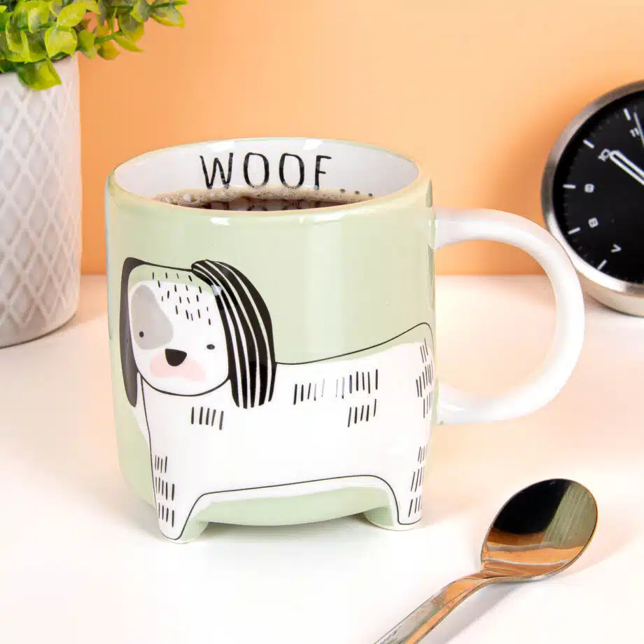 Ochtendhumeur? Niet als je wakker wordt met dit schattige hondje dat “WOOF” naar je blaft vanuit je koffiemok. Deze groene mok heeft een hondje erop dat zo lief kijkt dat je ochtendchagrijn geen schijn van kans heeft. Perfect voor op kantoor, thuis of gewoon overal waar je koffie nodig hebt en een beetje hondenliefde. Want waarom zou je normaal koffie drinken als je ook kan woofen?