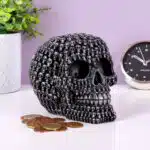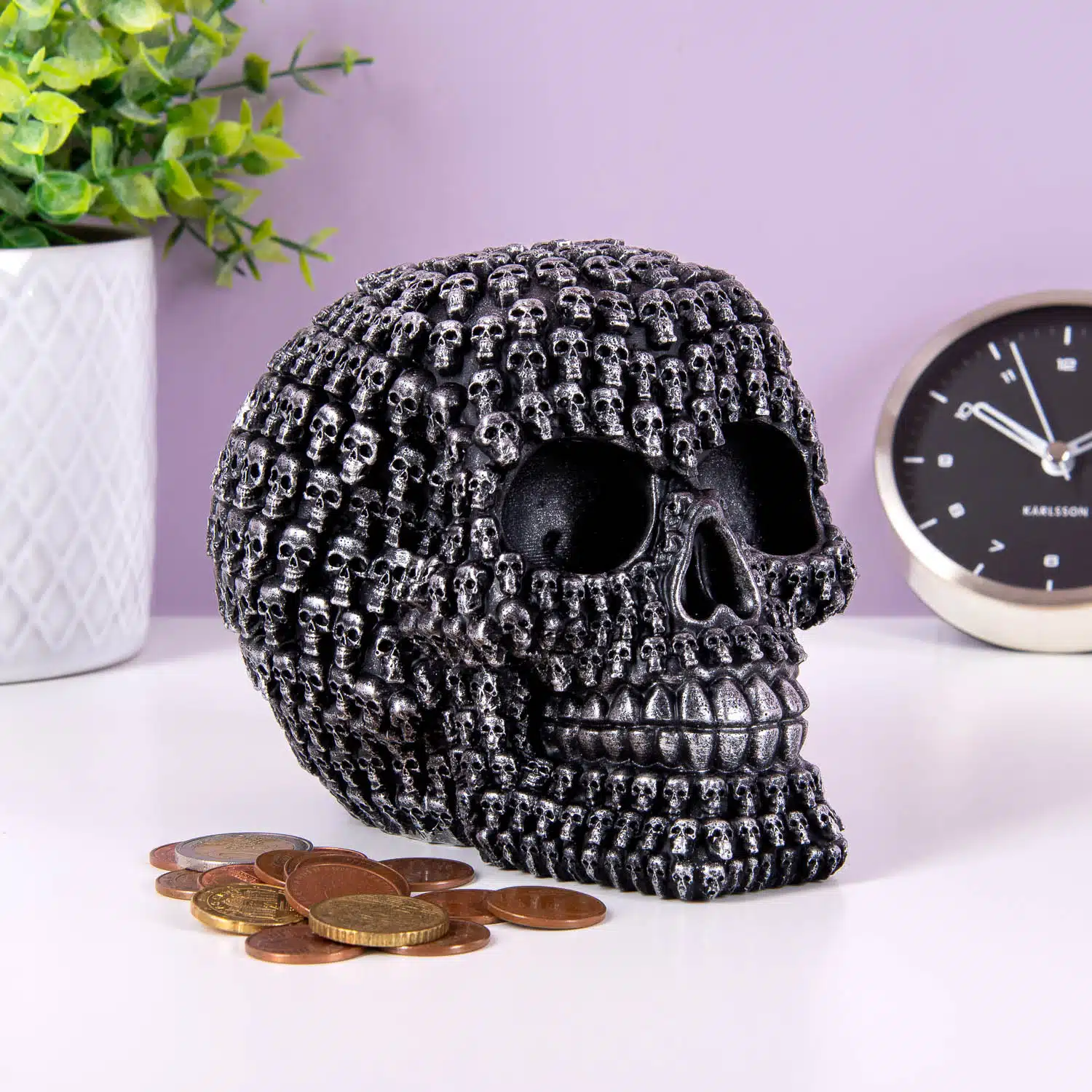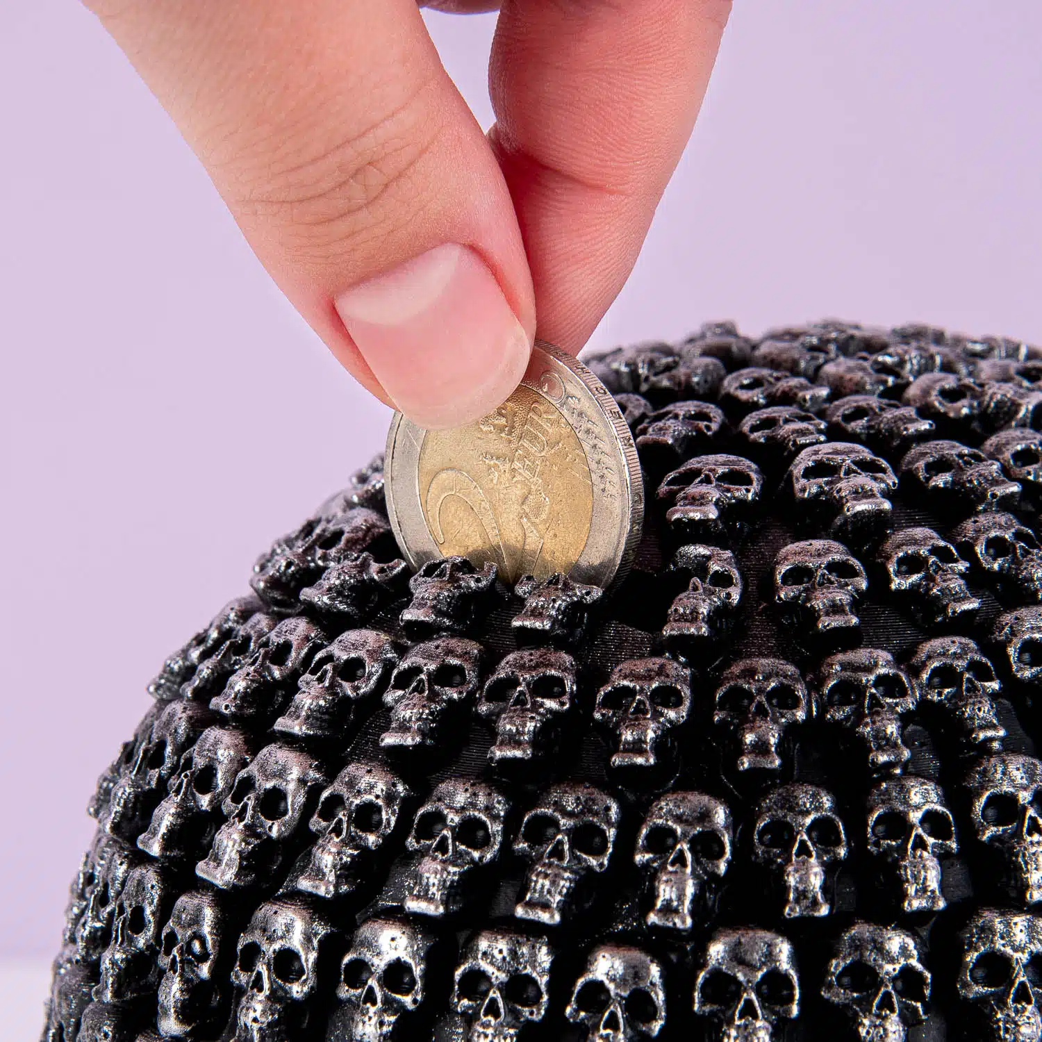 Wil je voorkomen dat je kleine broertje je spaargeld steelt? De Schedel spaarpot met slot is een effectieve manier om jattende huisgenoten af te schrikken. Deze angstaanjagende spaarpot heeft de vorm van een doodskop, maar dat is niet alles. Hij is namelijk ook versierd met tientallen kleine schedeltjes. Om het nog lastiger te maken om geld eruit te halen, is de spaarpot voorzien van een slot. Berg de sleutel goed op, dan kan niemand bij jouw geld!