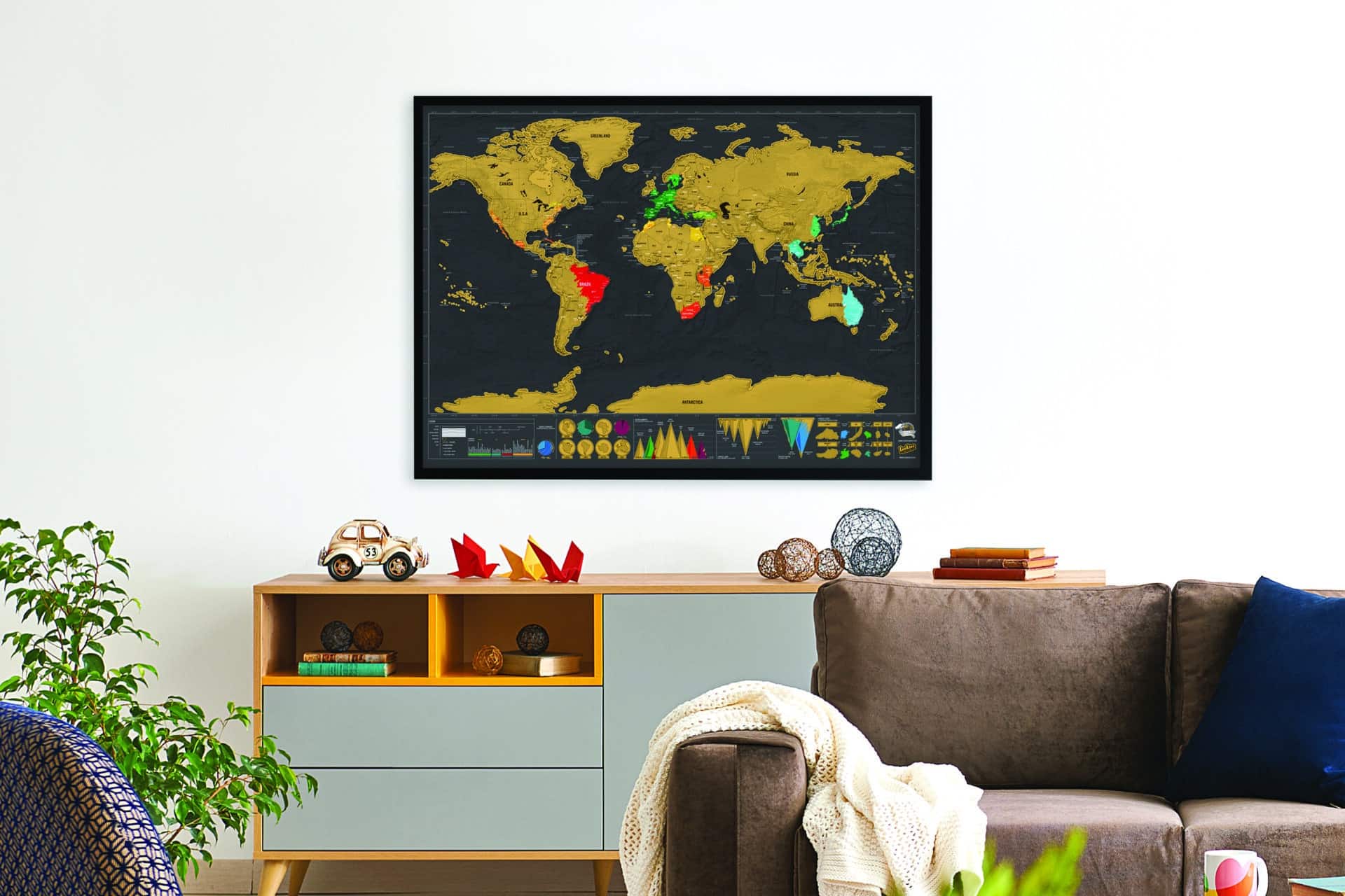 Zwarte kraswereldkaart met laagje goudkleurig folie. Op de kraswereldkaart kan je precies aangeven waar je allemaal al bent geweest door het laagje goudfolie van de landen weg te krassen met een muntje. De landen hebben felle kleuren die mooi contrasteren met de zwarte achtergrond.
