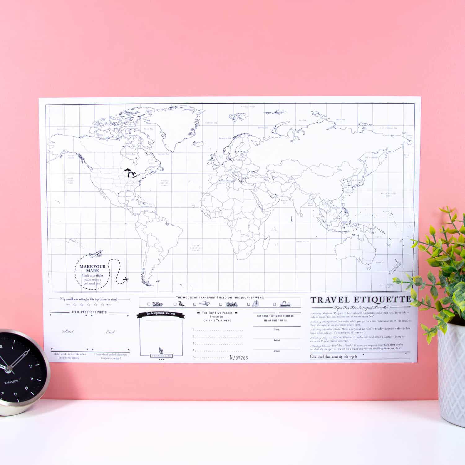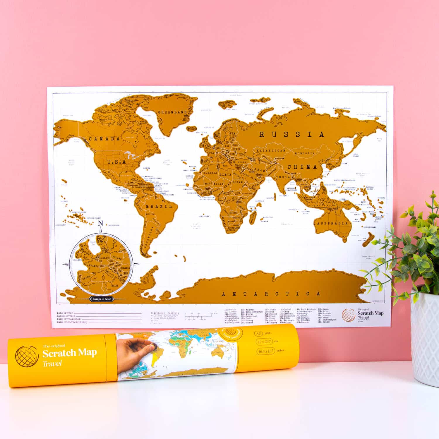 Witte kraswereldkaart met laagje goudkleurig folie in een handig reisformaat. Op de kraswereldkaart kan je precies aangeven waar je allemaal al bent geweest door het laagje goudfolie van de landen weg te krassen met een muntje.