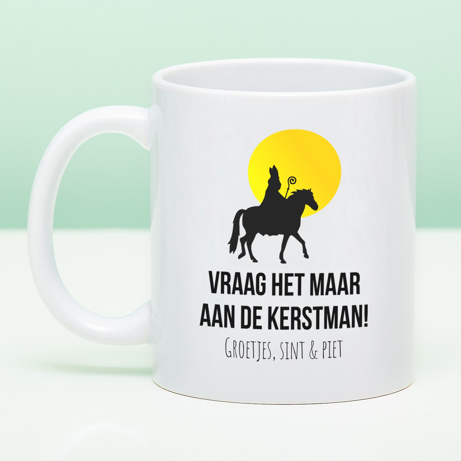 Pakjesavond… vol verwachting klopt je hart en open je het pakje met jouw naam. Het is een beker! Maar eentje die leuker is om te geven, dan om te krijgen. Op de beker staat namelijk de tekst: Vraag het maar aan de kerstman! Groetjes, Sint & Piet. De Sinterklaasmok Vraag het maar aan de kerstman is daarnaast voorzien van een afbeelding van de Sint op zijn paard. Niet helemaal het cadeautje waar je van droomde, toch? Maar wel hilarisch om te geven en de reactie van je collega, vriendin of partner te zien.