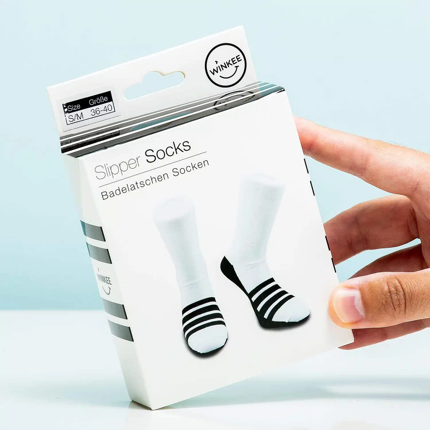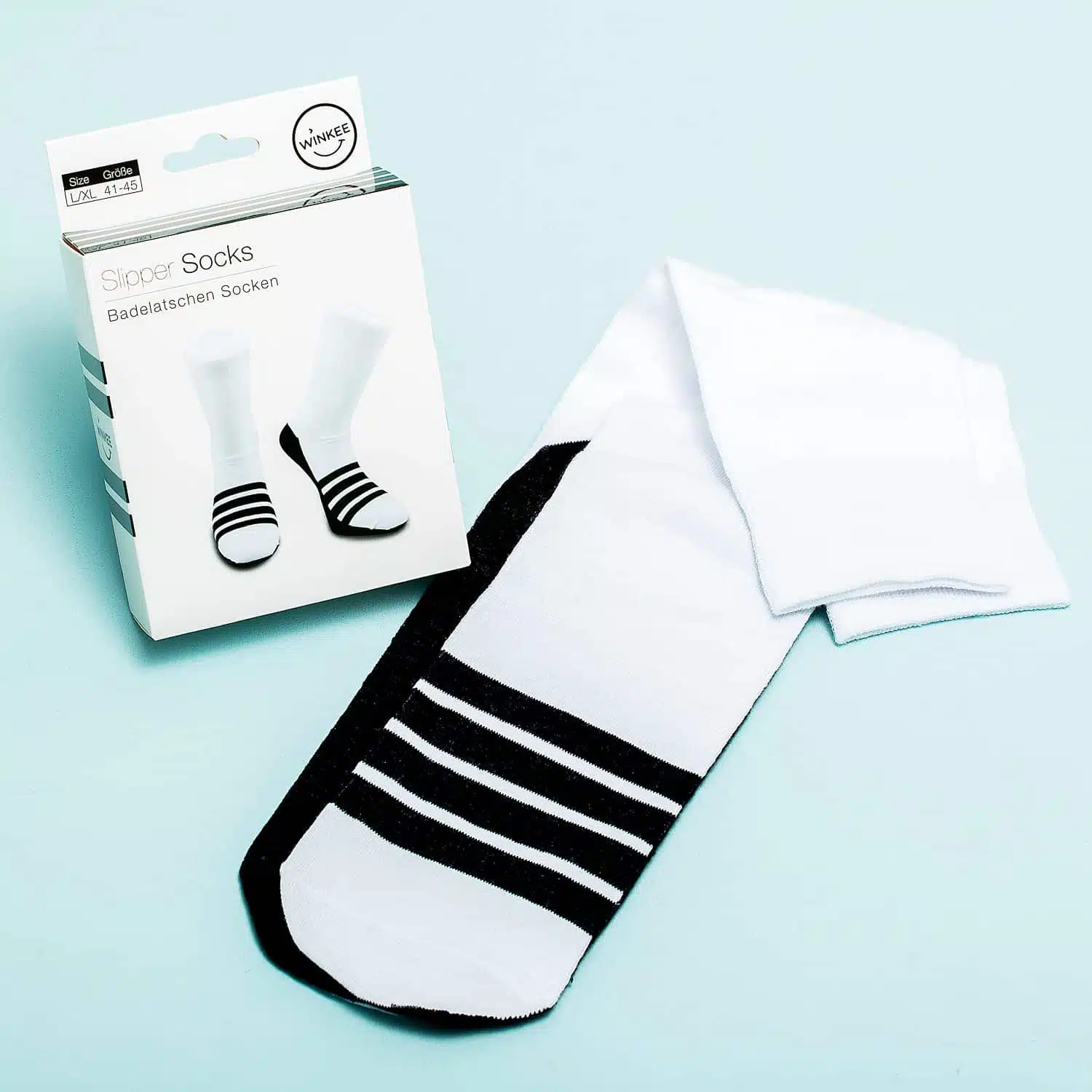 Sokken in je badslippers cute? Nou… in elk geval hip! Kun je je badslippers van een merk veroorloven? Kies dan voor de op één na beste optie: de Slipper sokken van Winkee. Met deze witte sokken lijkt het net alsof jij ook zwart-wit gestreepte badslippers draagt. Die zitten namelijk ingeweven in de stof. Grappig stel sokken voor iedereen die mee wil doen met de badslippertrend. De sokken zijn leverbaar in twee verschillende maten.