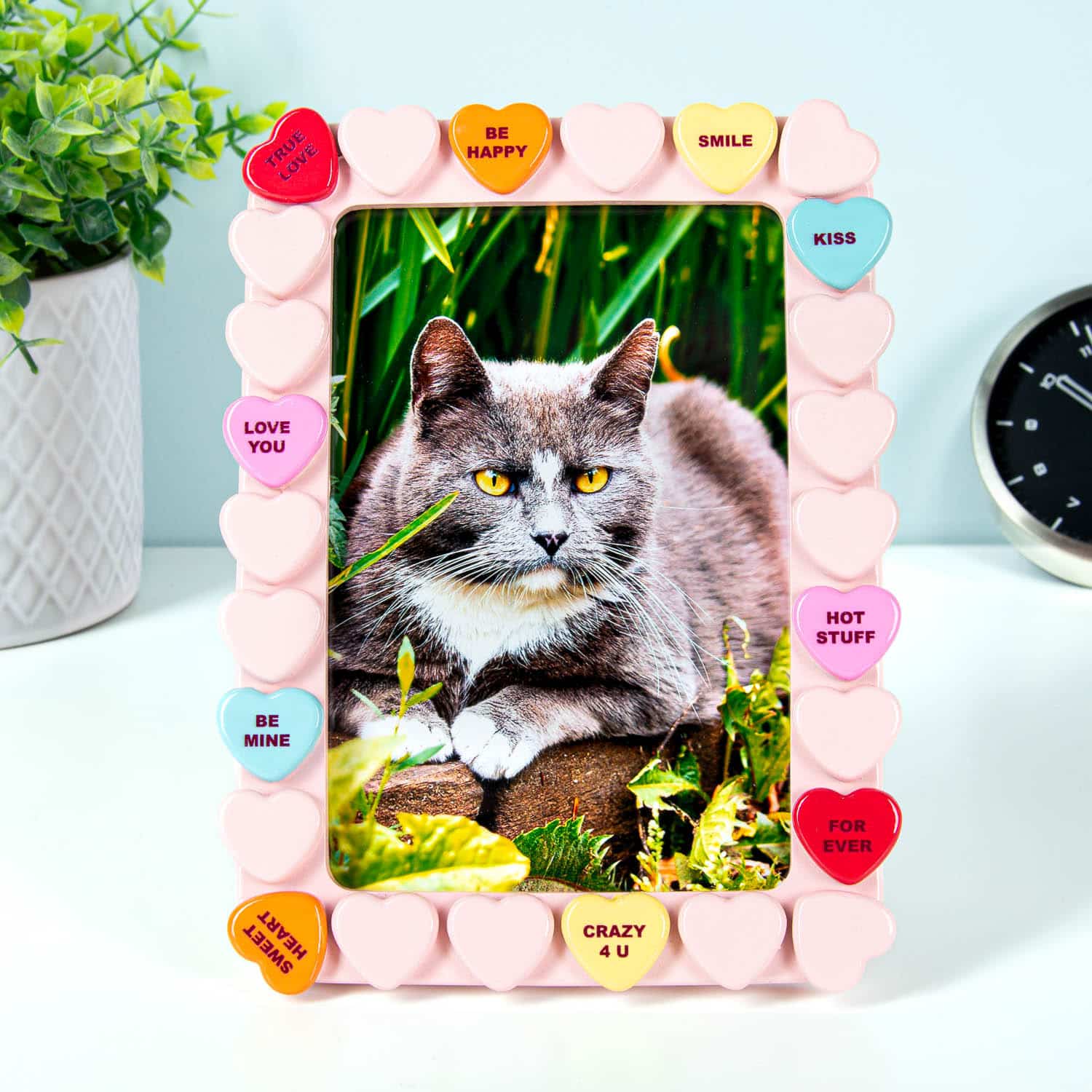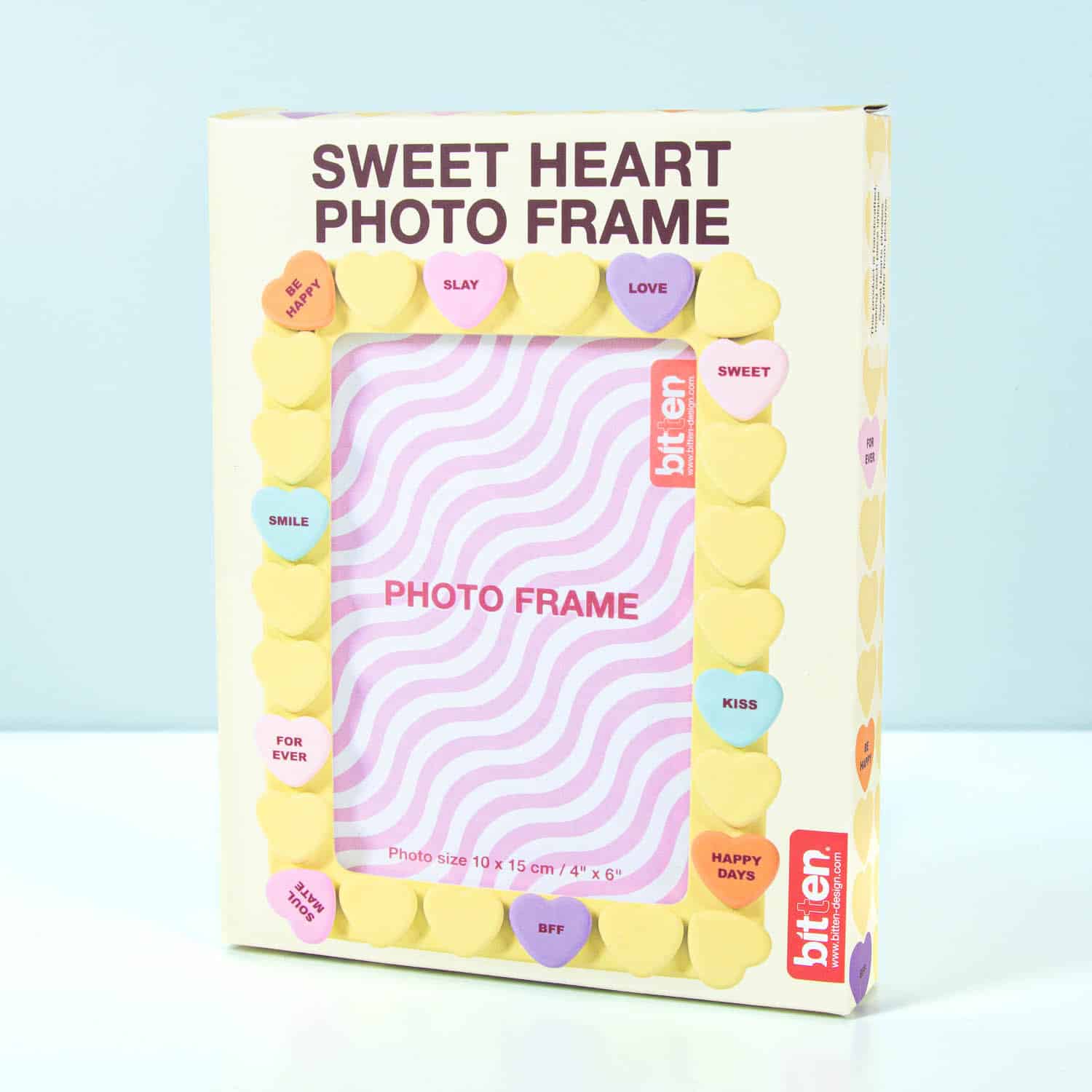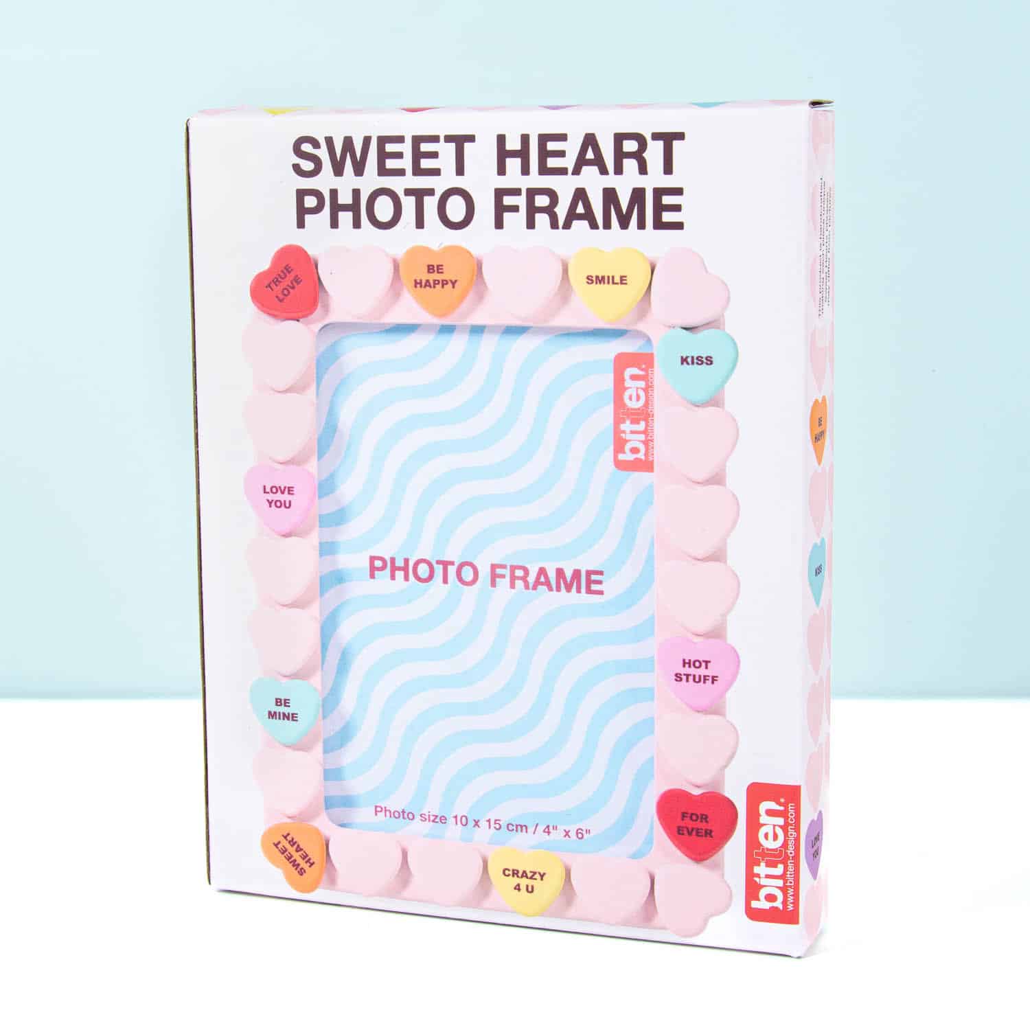 Het Snoephart fotolijstje van Bitten is er voor iedereen die zijn mooiste herinneringen op een schattige manier wil laten zien. Dit lieve fotolijstje is versierd met kleine snoephartjes, elk met schattige, lieve berichtjes als Love You, It’s a Match en Soul Mate. Perfect voor zoete foto’s van jullie speciale momenten.