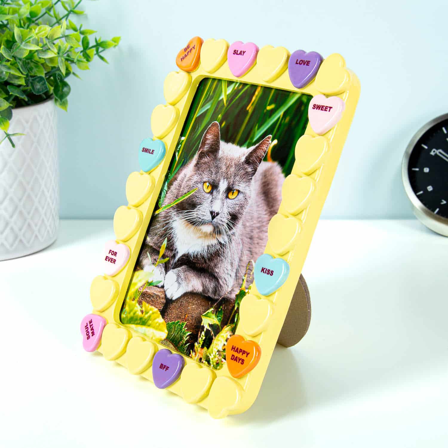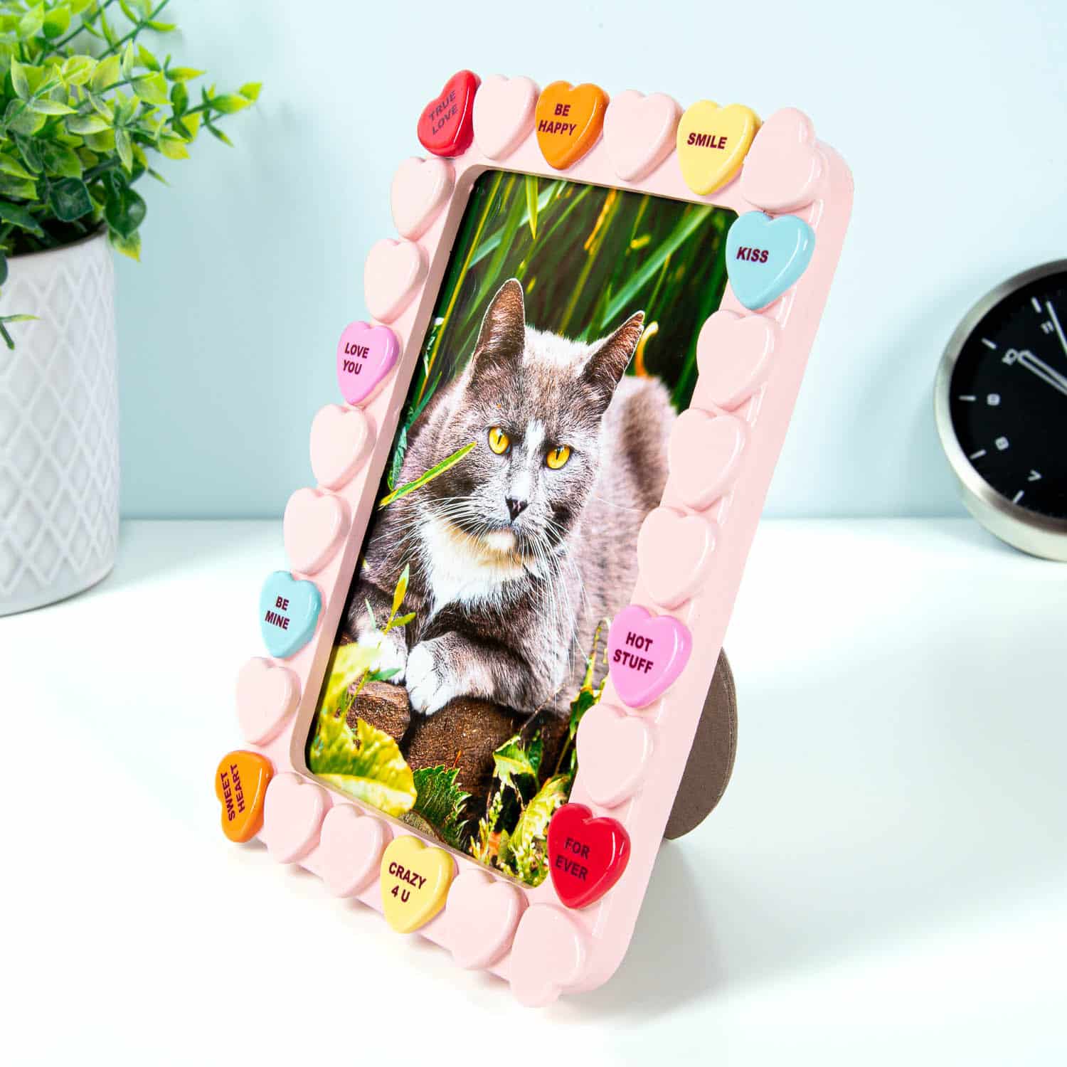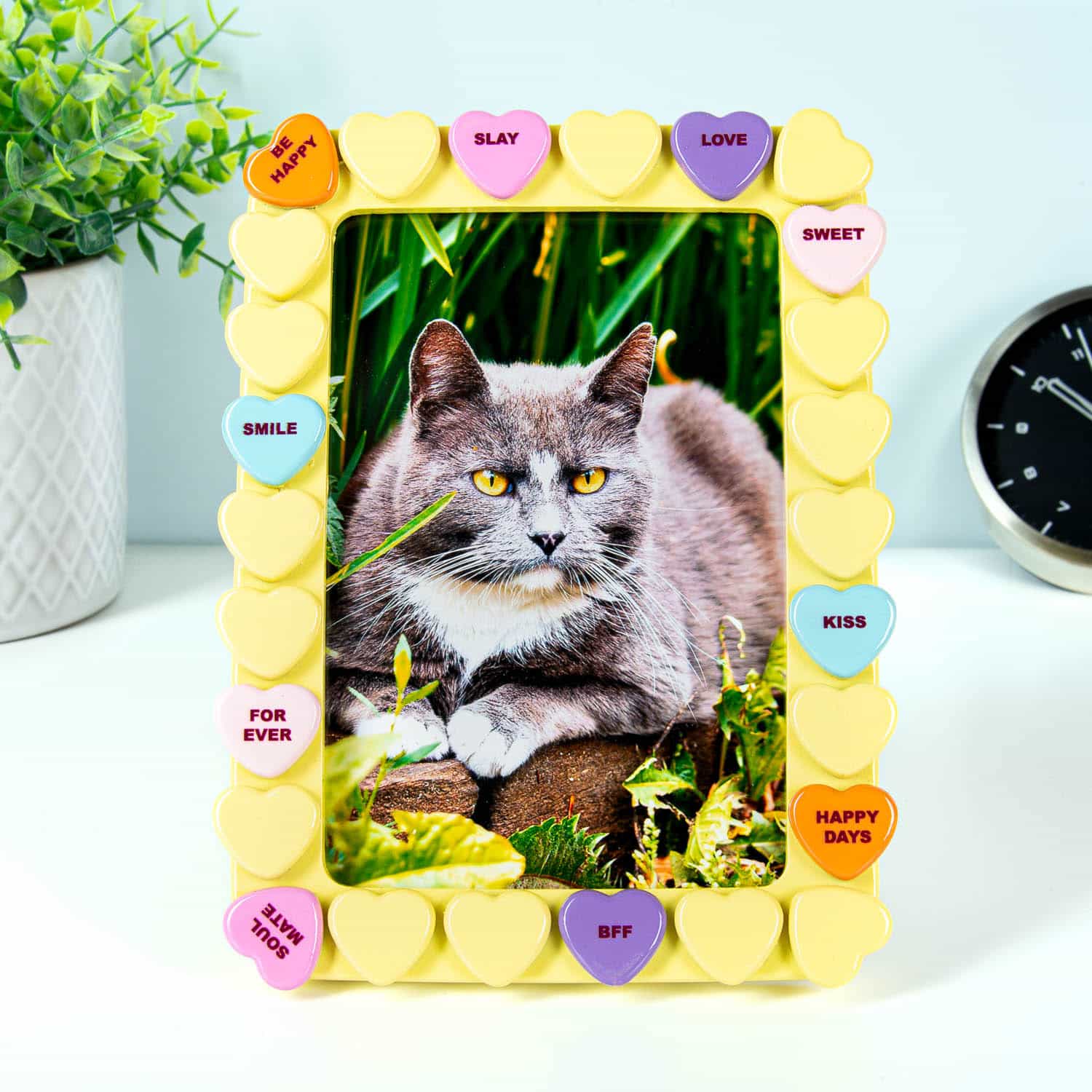 Het Snoephart fotolijstje van Bitten is er voor iedereen die zijn mooiste herinneringen op een schattige manier wil laten zien. Dit lieve fotolijstje is versierd met kleine snoephartjes, elk met schattige, lieve berichtjes als Love You, It’s a Match en Soul Mate. Perfect voor zoete foto’s van jullie speciale momenten.