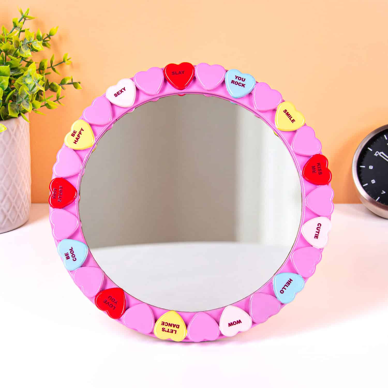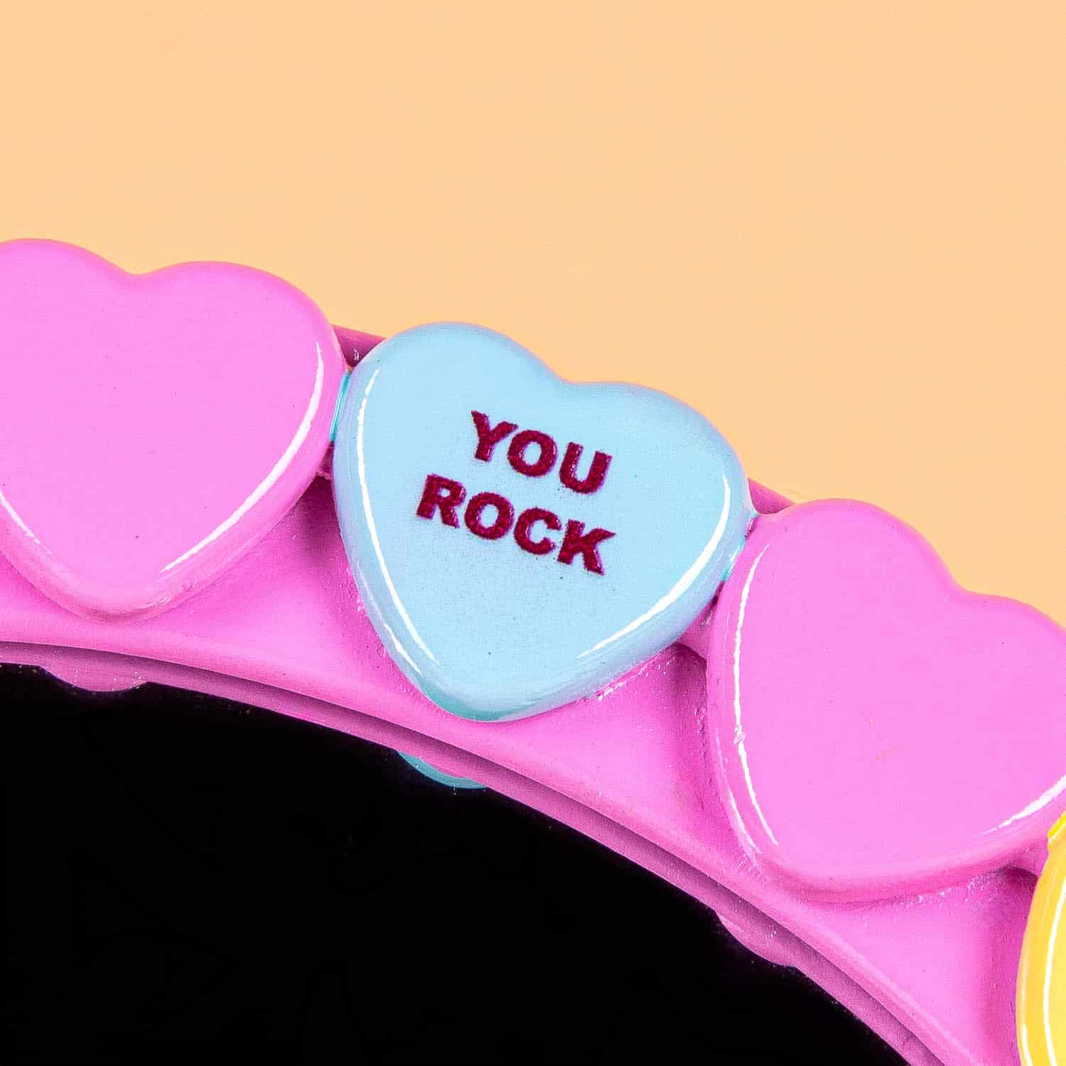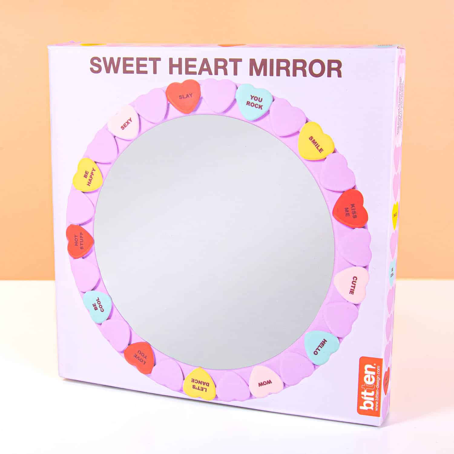 De Snoephart spiegel van Bitten is er voor iedereen die zijn make-up routine wat extra liefde wil geven. Deze charmante paarse make-up spiegel is omlijst met kleine snoephartjes met motiverende berichtjes als You Rock, Sexy, Slay en Smile. Perfect voor op je kaptafel, badkamer of om op te hangen. Deze spiegel voegt feel-good vibes toe aan je dagelijkse beautyroutine.