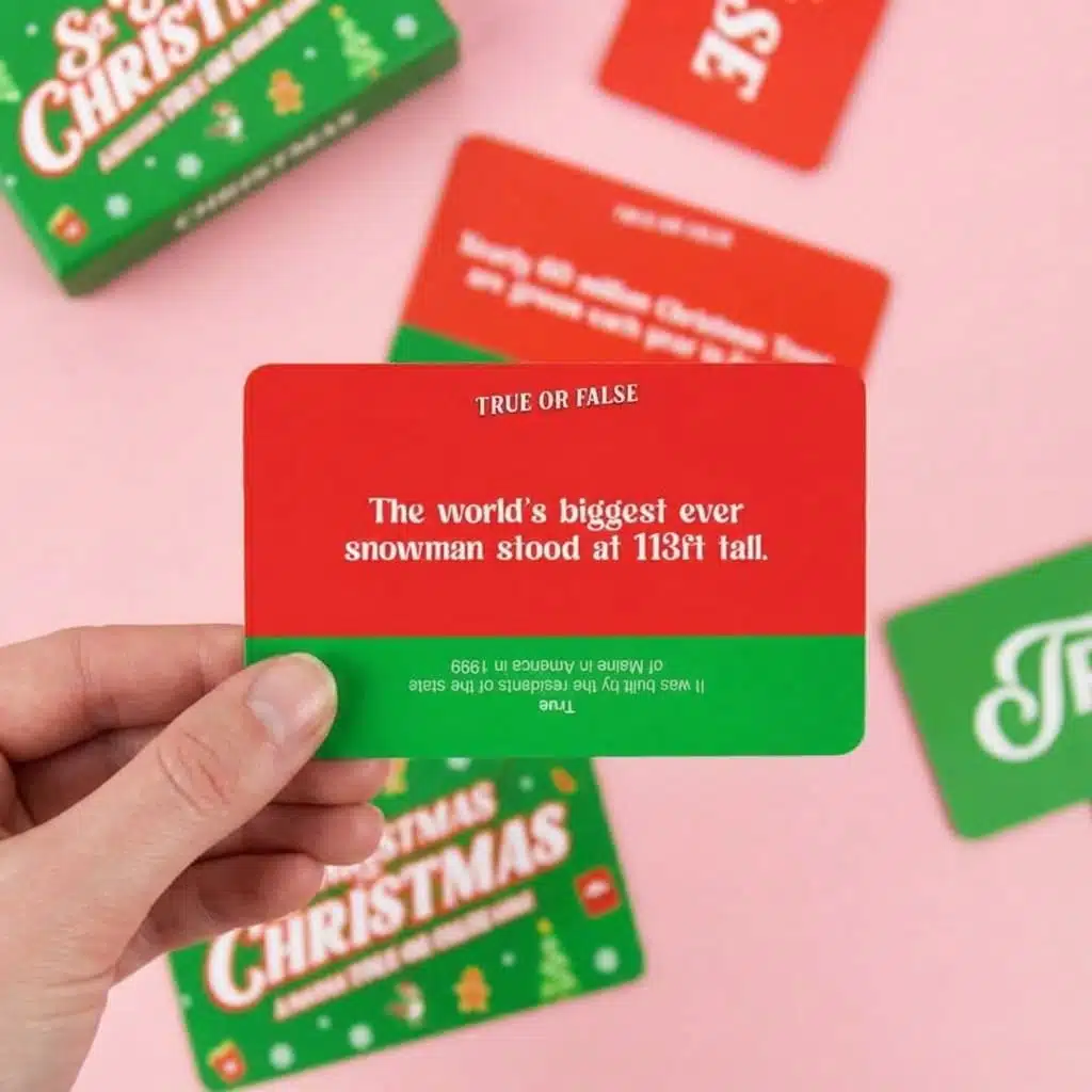 Denk je een kerstexpert te zijn? Dan is dit So This is Christmas kaartspel van Gift Republic jouw uitdaging. Met 100 waar-of-niet-waar kerstfeiten ontdek je de gekste kerstverhalen. Van rare tradities tot bizarre mythes, bereid je voor op verrassing en vermaak. Inclusief 6 antwoordpaddles, dus iedereen kan meespelen. Perfect voor kerstdiners, spelletjesavonden of gewoon om je familie te verslaan.