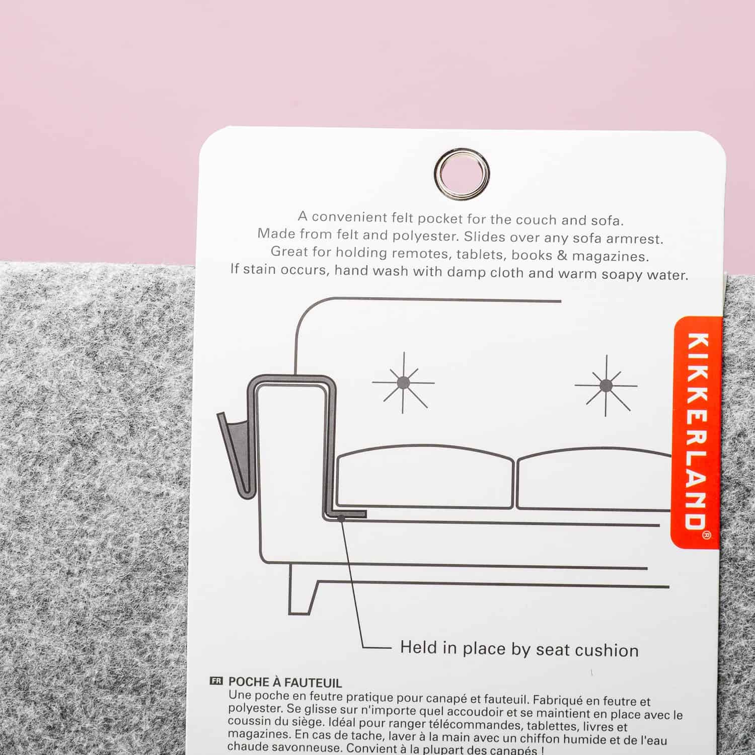 Opbergzak die je aan je bankleuning hangt. De zak is gemaakt van grijs vilt en biedt ruimte aan brillen, afstandsbedieningen, telefoons, boeken en tablets. Aan de onderkant is een opening voor je laadkabel. Het langste gedeelte schuif je onder het kussen van je bank.