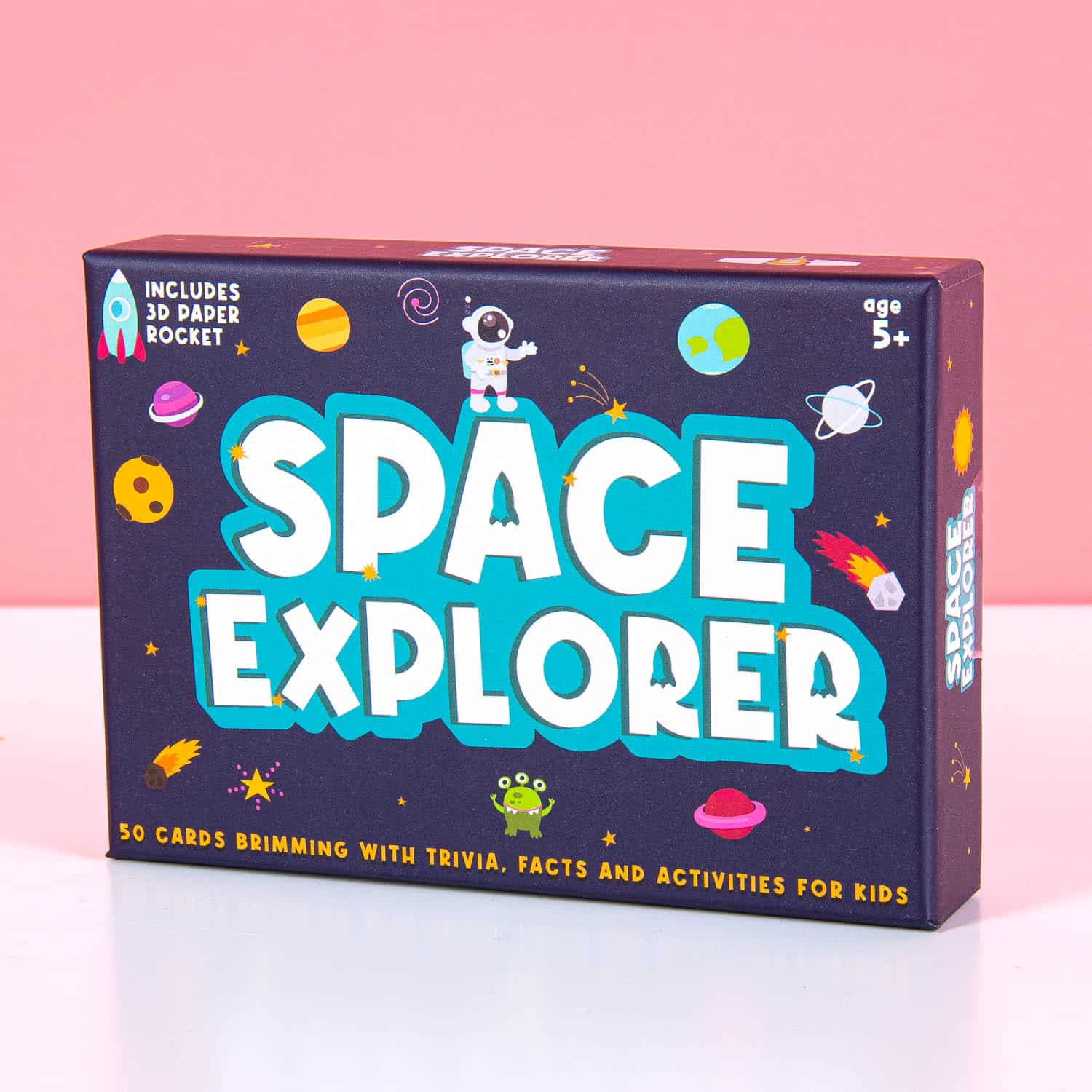 Klaar om je kleine astronaut de ruimte in te schieten? Met de Space Explorer triviakaarten voor kids van Gift Republic krijg je 50 kaarten vol ruimte-trivia, gekke weetjes en interactieve opdrachten wordt je kind een wandelende sterrengids. Voor kids (en volwassenen) die denken dat Pluto nog steeds een planeet is (spoiler: nope). Als extraatje krijg je een 3D papieren ruimteschip om in elkaar te knutselen, want wat is een ruimtereis zonder je eigen spaceship? Perfect voor verjaardagen, lange autoritten of gewoon om je kind even van zijn scherm af te krijgen.