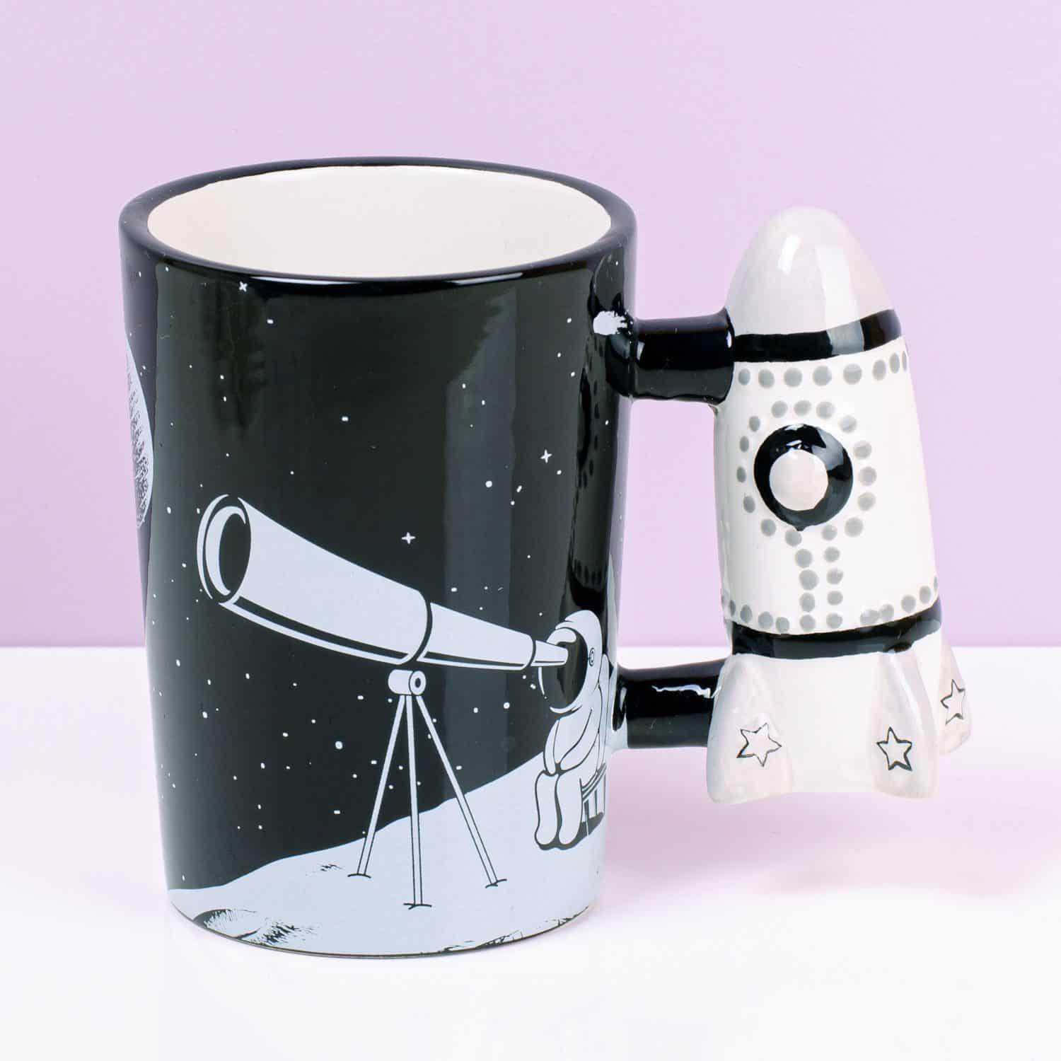 Het is de droom van veel kinderen: astronaut worden. De Space mok met raket oor van Out of the Blue is voorlopig de makkelijkste manier om in de buurt van de ruimte te komen. Deze unieke mok heeft een oor in de vorm van een raket en laat je kind even wegdromen bij zijn astronomische ambities. Op de beker zelf staat een astronaut die door een telescoop kijkt.