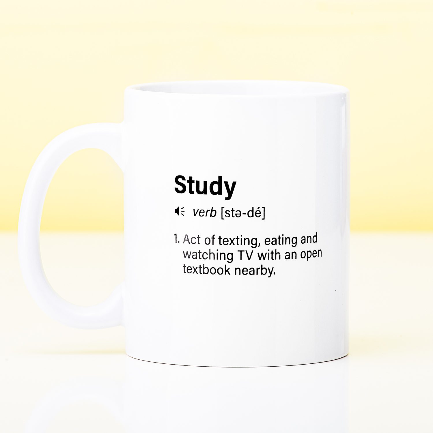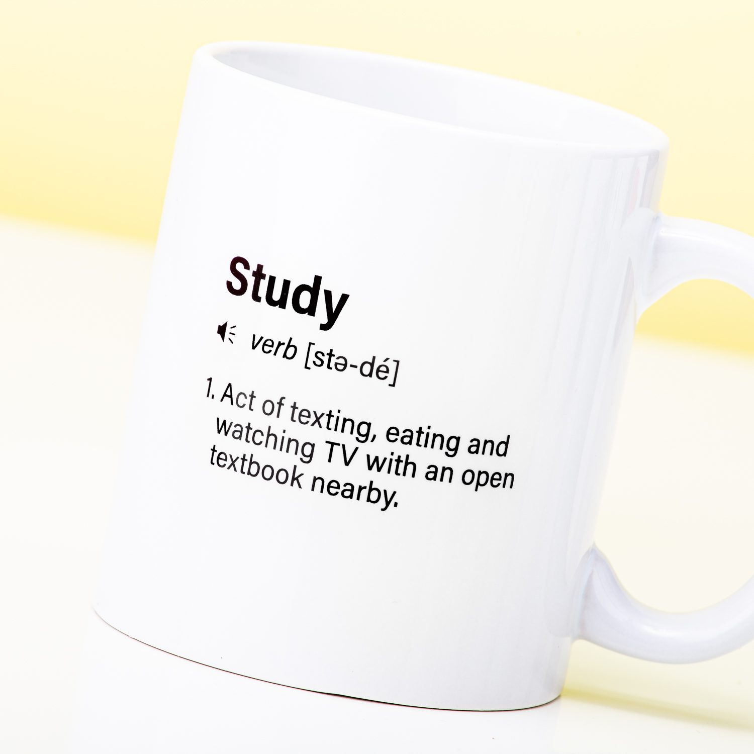 Druk, druk, druk: jij doet dagelijks uren over je huiswerk. En dat komt heus niet omdat je tijdens het studeren wordt afgeleid door je telefoon of Netflix. Toch? De grappige Study mok doet je vermoeden van wel. Deze koffiebeker is voorzien van de tekst: Study. Act of texting, eating and watching TV with an open textbook nearby. Een leuk cadeautje voor studenten en scholieren die blokken voor hun examens en toetsen.