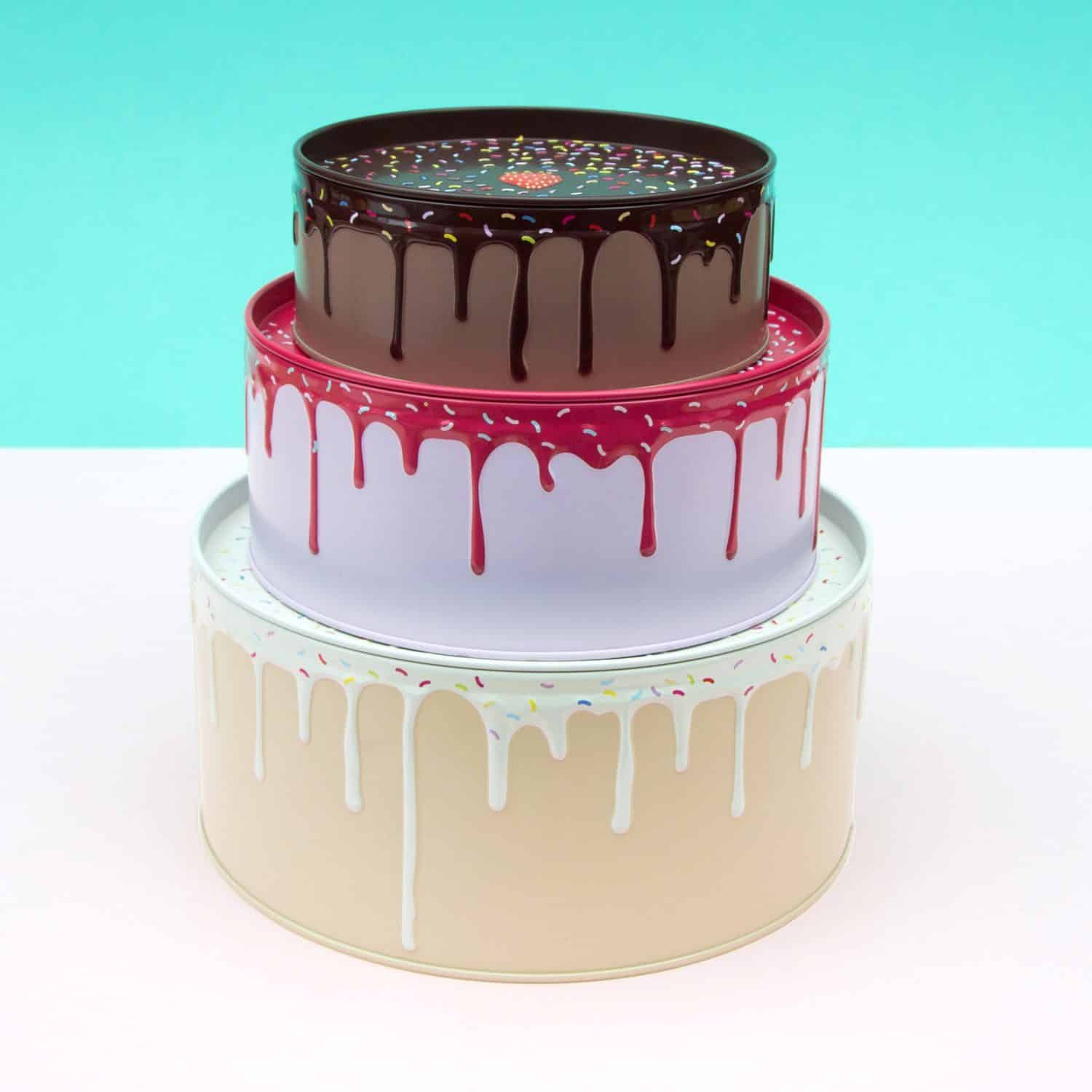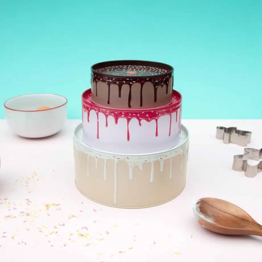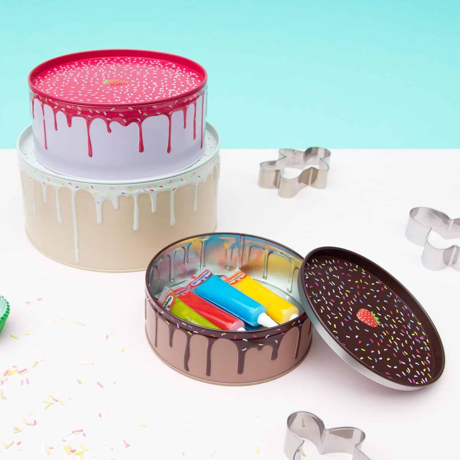 Houd je huis netjes opgeruimd met de Taart opbergcontainers van Suck UK. Als je alle opbergcontainers op elkaar zet, dan ziet hij eruit als een taart. De blikken hebben allemaal verschillende smaken en zijn versierd met een druipend glazuur en sprinkles. Het grootste blik is 20 x 9 centimeter en ziet eruit als een vanillecake met witte chocoladeglazuur. Daar bovenop staat een roze blik met een rood-roze glazuur en daar bovenop een bruin blik met chocoladeglazuur. In de opbergblikken kun je al je bakspullen kwijt, maar ook je gebakken koekjes. En natuurlijk ook andere dingen, zoals sieraden, sleutels en pennen. Super leuk voor in de keuken, maar ook voor in een tiener- of kinderkamer.