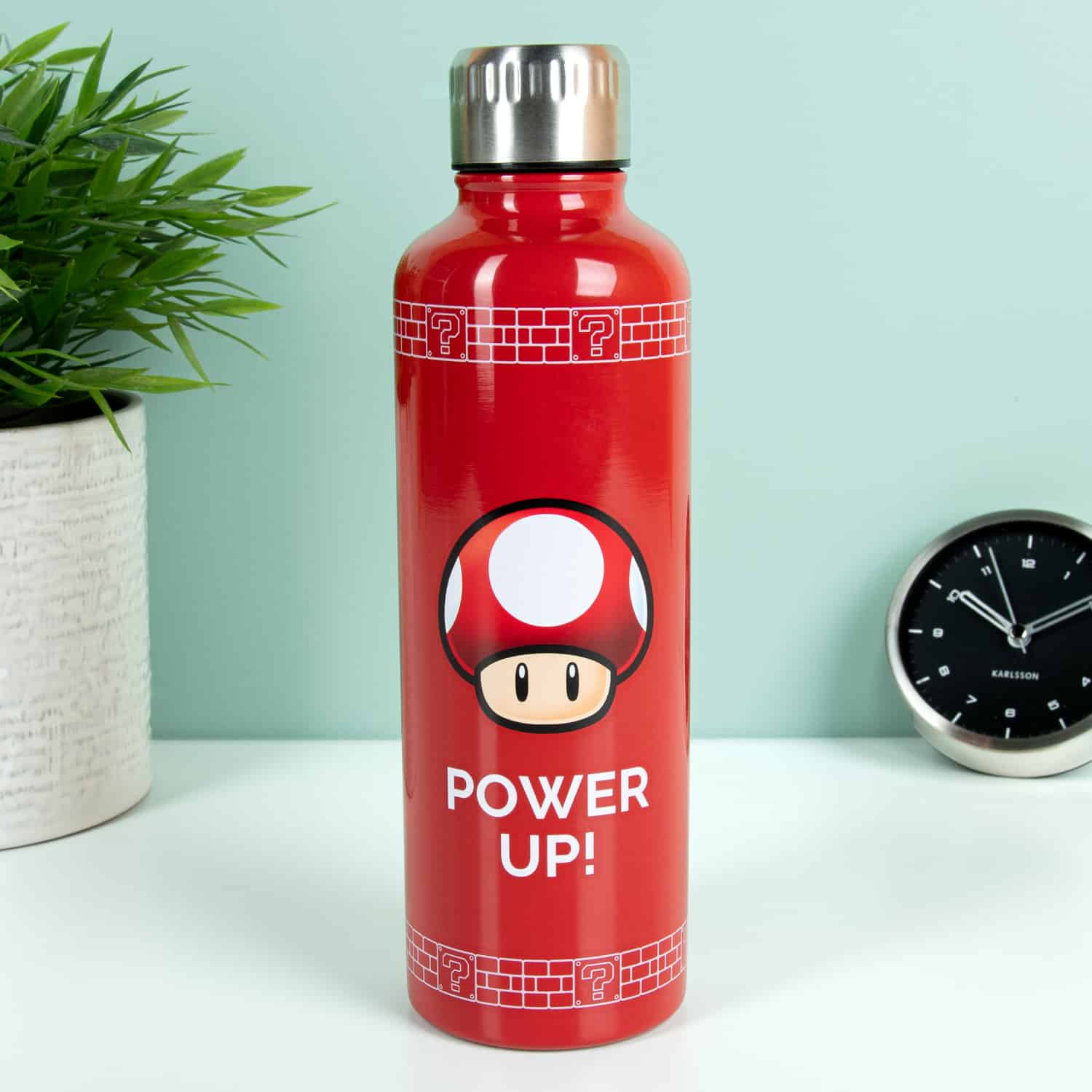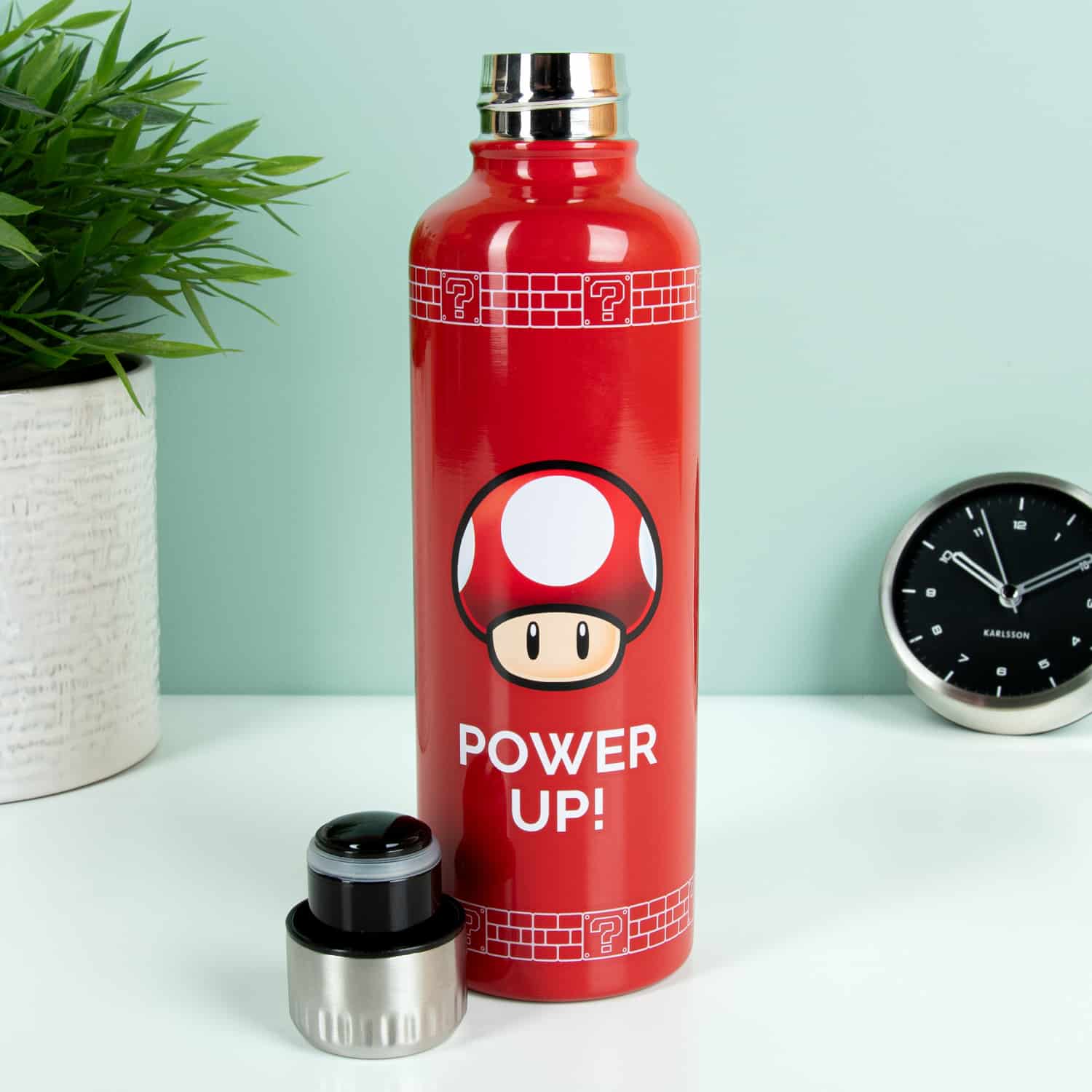 Van gamen krijg je dorst. En die les je met de Super Mario Power Up waterfles van Nintendo. Deze brandweerrode thermosfles kun je vullen met zowel warme als koude drinken. Je koude water blijft extra lang koel en je warme koffie juist extra lang warm. De Super Mushroom uit Super Mario herinnert je eraan om regelmatig te hydrateren met de tekst Power Up. Met draaidop, dus veilig mee te nemen in de auto of je tas.