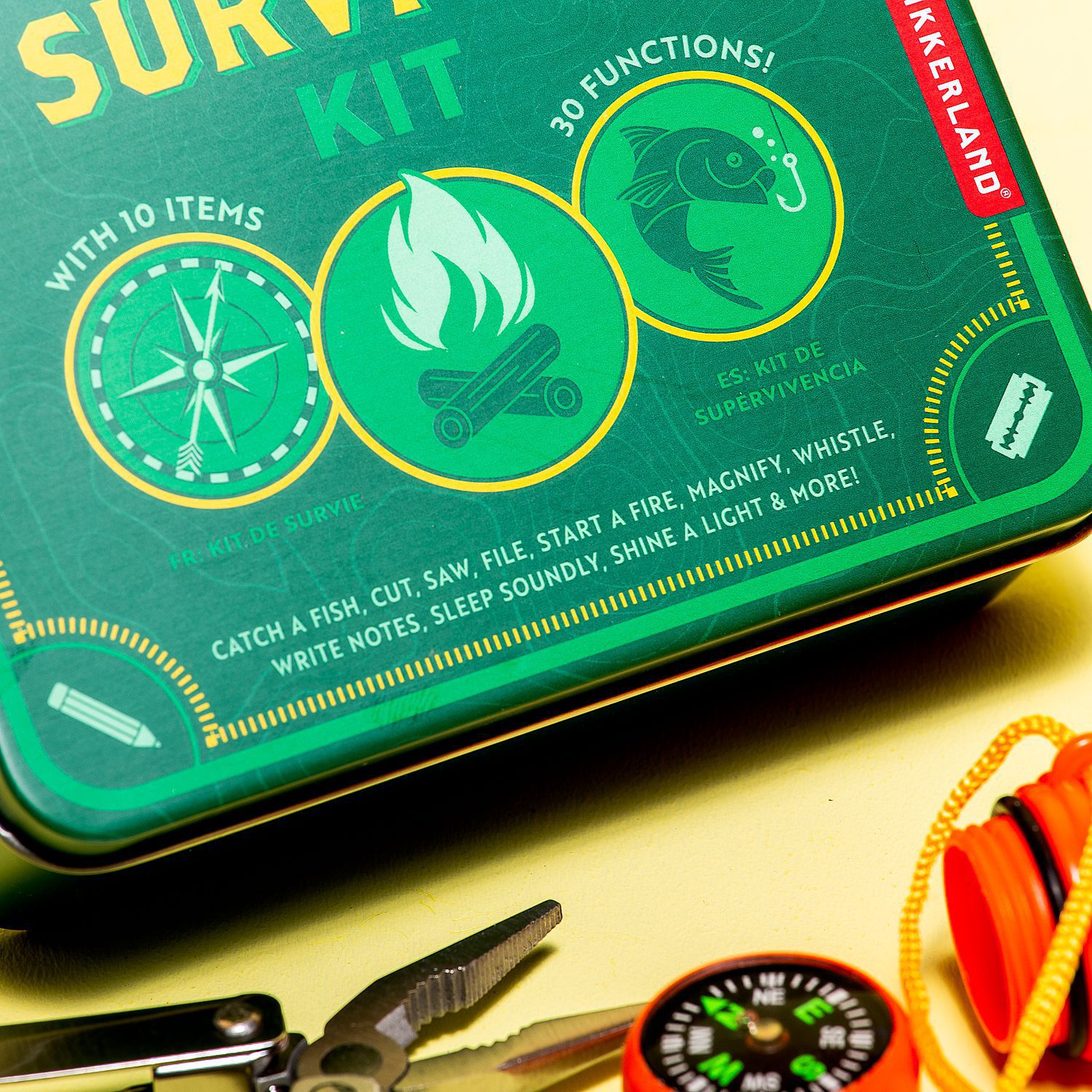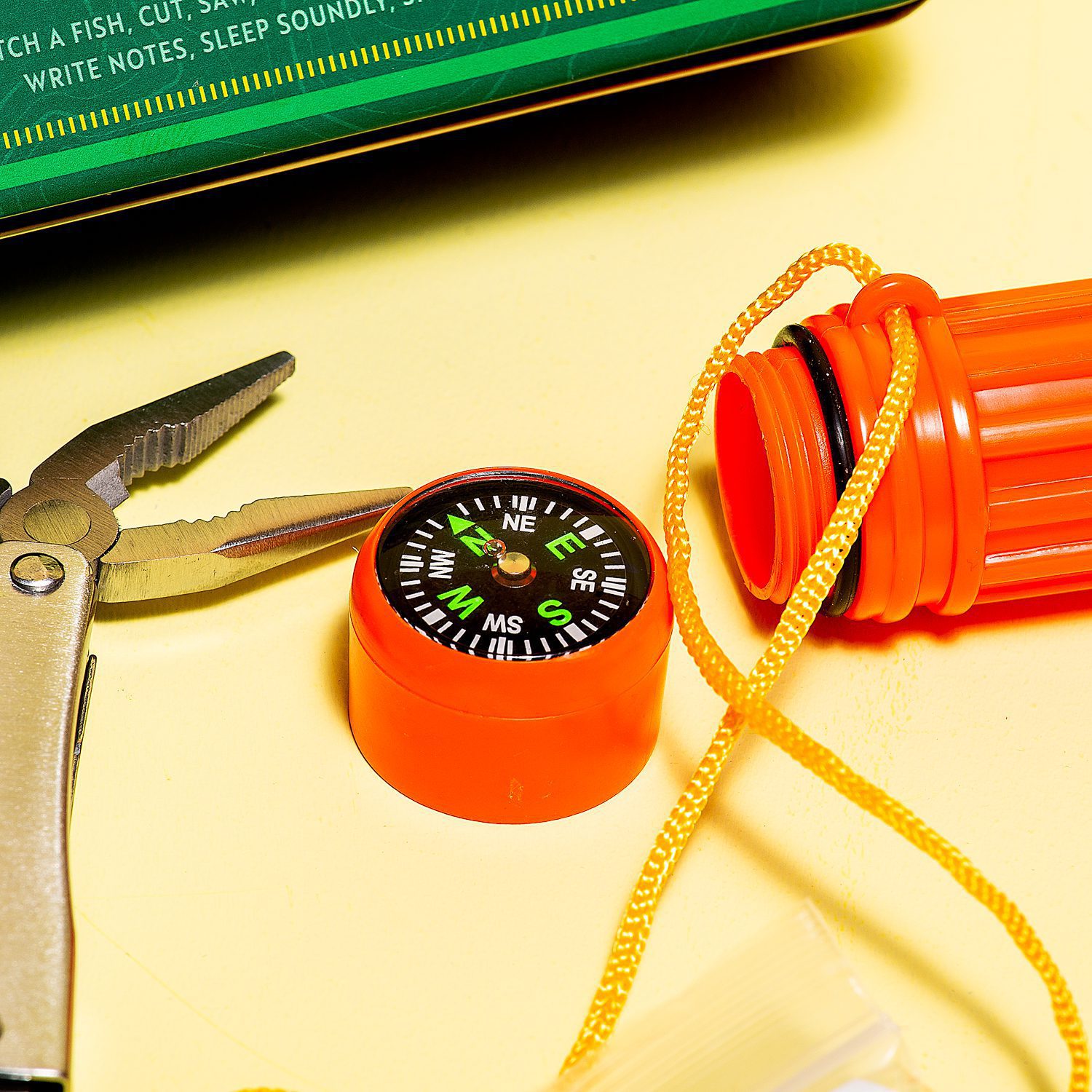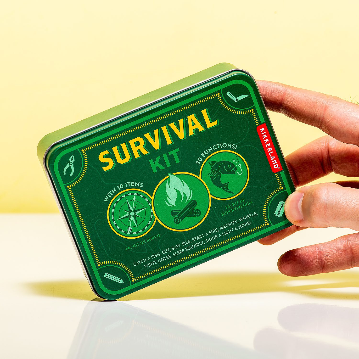 Kamperen in de bossen, zonder telefoon? Kan best, als je de Survivalkit in een blikje van Kikkerland bij je hebt. Want mocht je verdwalen, dan kun je je weg terug proberen te vinden met het kompas, een vis te vangen met de vislijn, hout zagen met het zaagje, vervolgens vuur maken met de vuursteen en lekker warm en rustig slapen met de oordopjes en nooddeken. Een welkome afwisseling van je drukke leven, toch?
