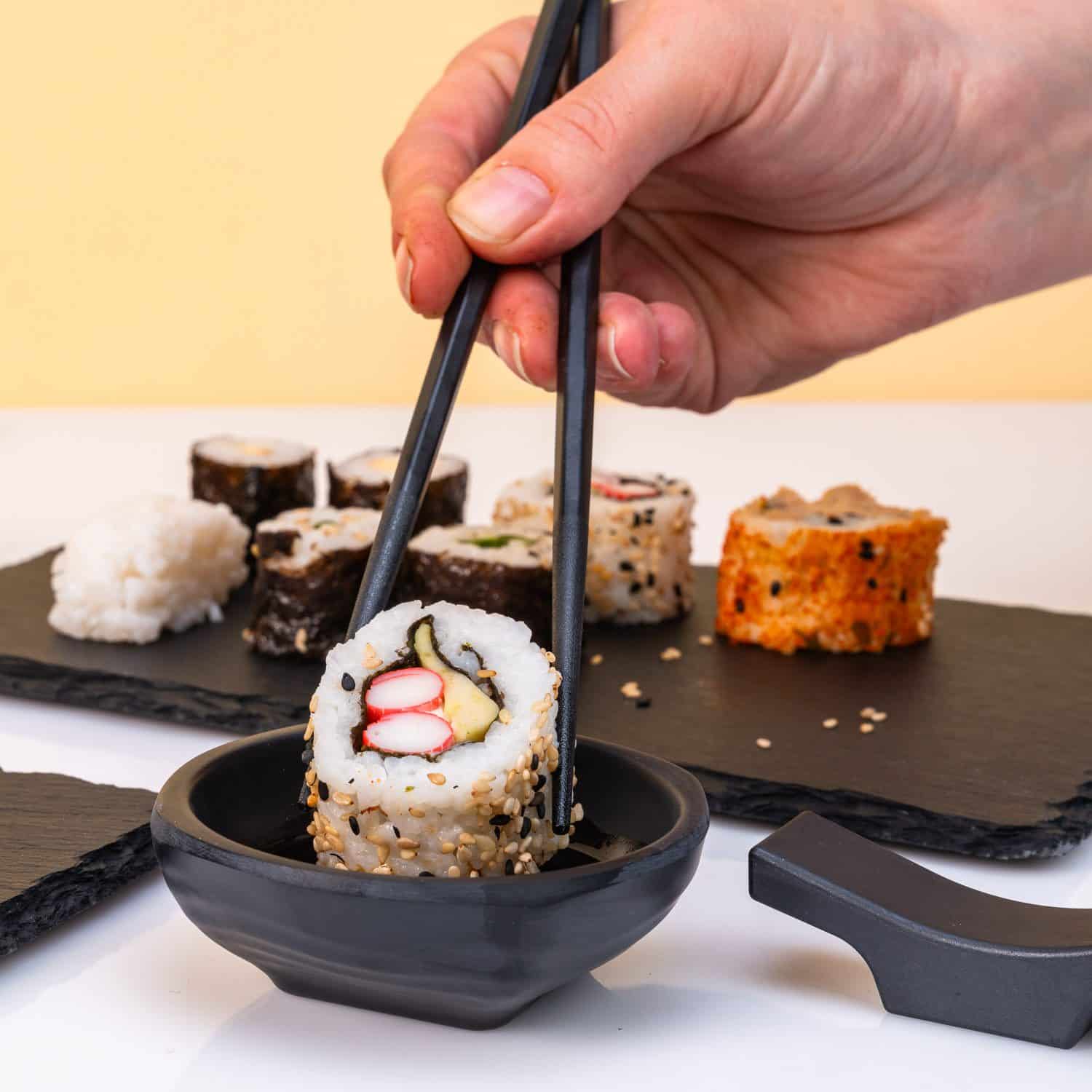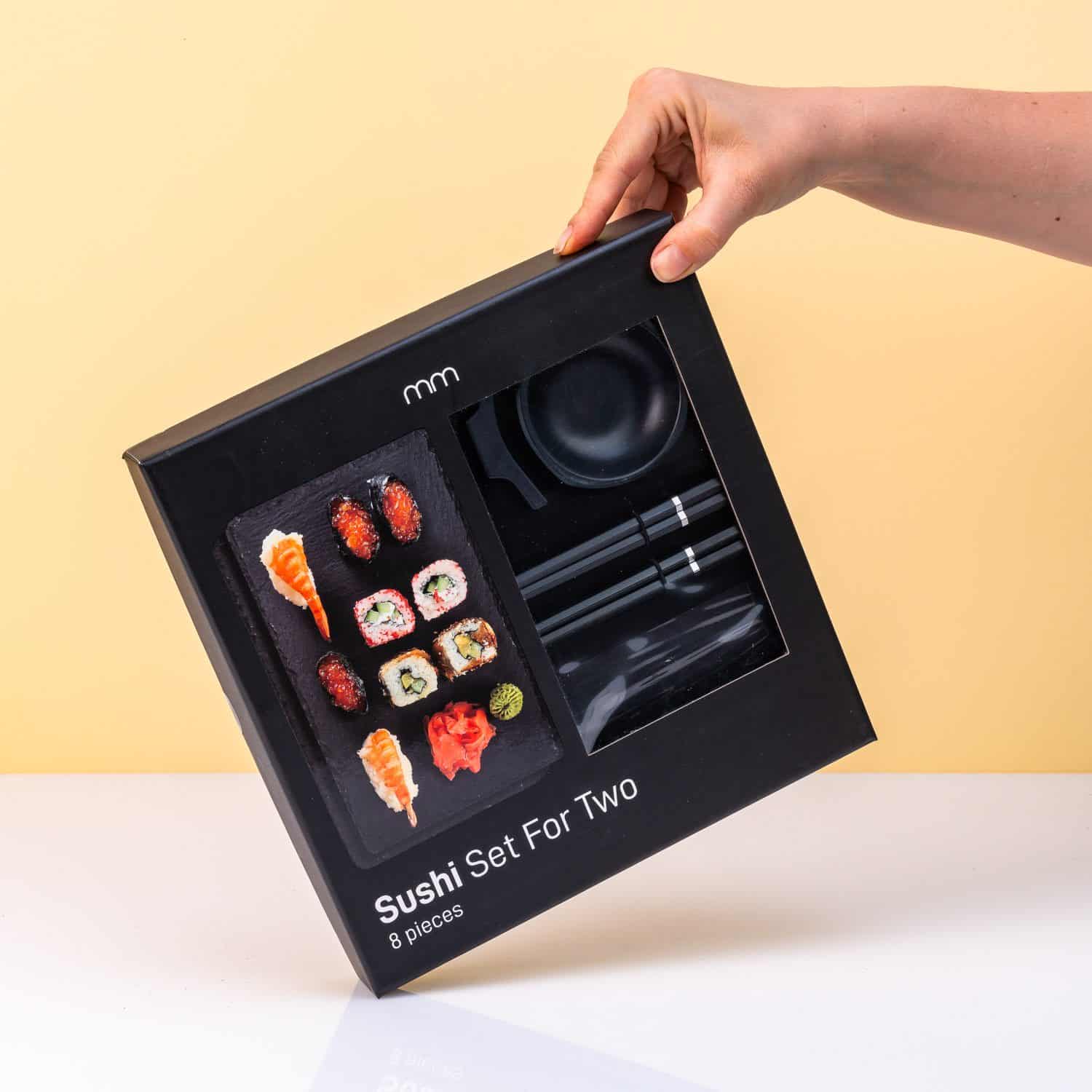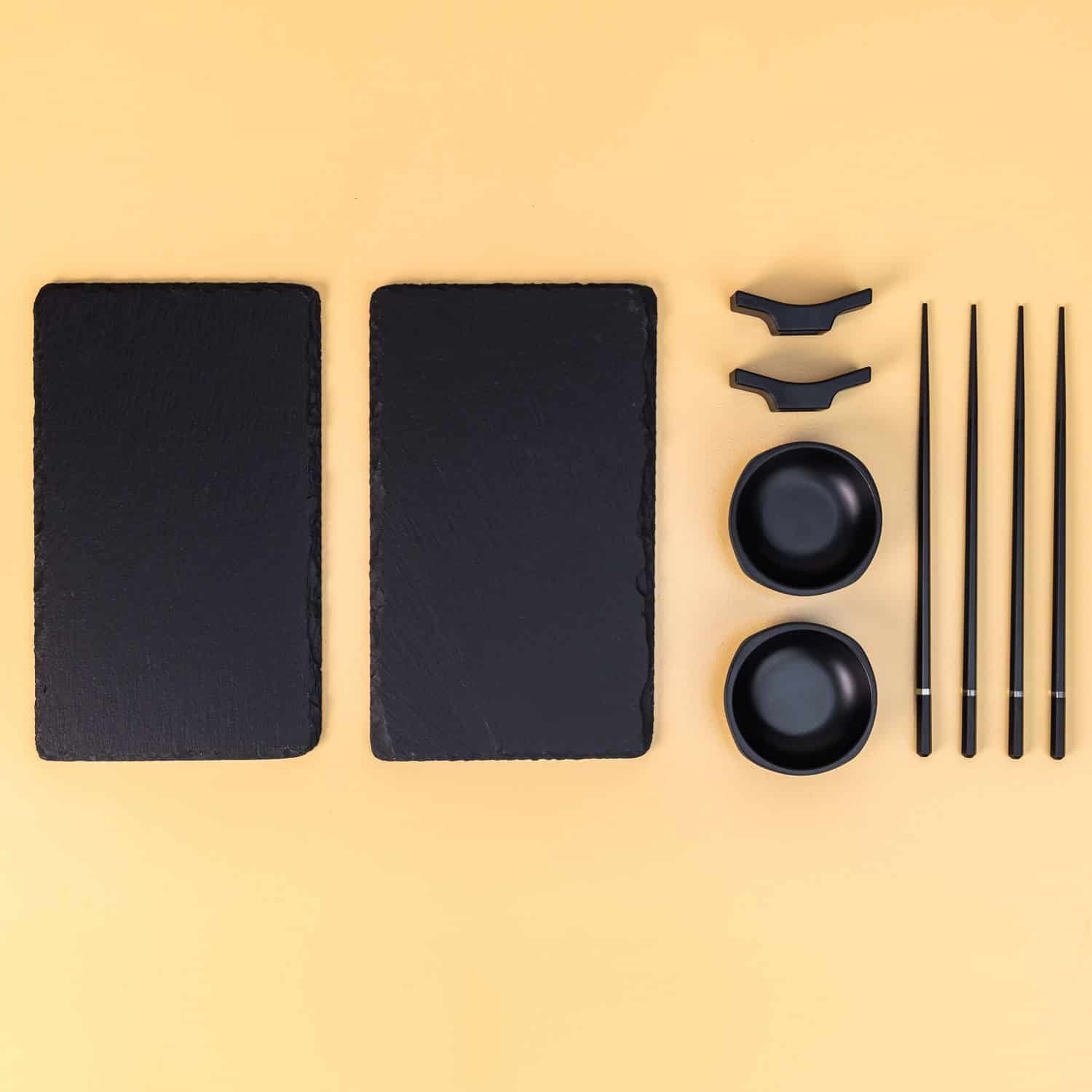 Of je het nu zelf maakt of besteld, met de Sushi set voor twee van MikaMax serveer je sushi op een professionele manier. De set bestaat uit twee leistenen bordjes, twee schaaltjes voor sojasaus, twee sets chopsticks en twee houders waar je je eetstokjes op kunt leggen. Met dit setje is het net alsof je in een restaurant zit, maar niemand kijkt gek op als je in je pyjama aanschuift. Win-win!
