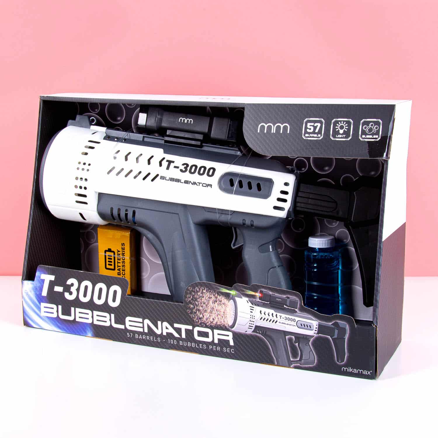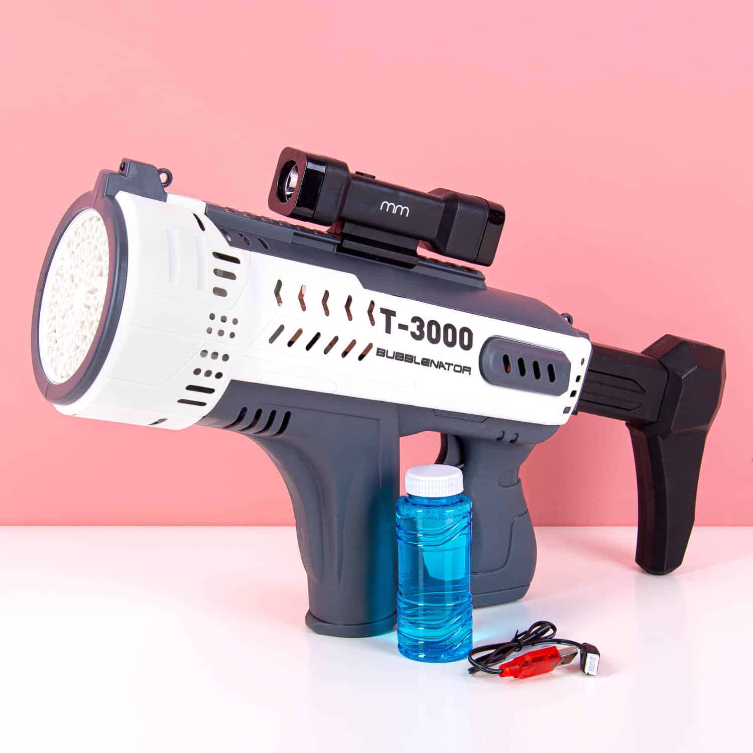 Een kinderfeestje, een bruiloft of vette poolparty wordt nóg leuker met het T-3000 bellenblaaspistool van MikaMax. Deze bubble gun maakt feestjes namelijk nog feestelijker. De bubble gun blaast razendsnel zeepbellen uit zijn 57 openingen en laat ze er extra spectaculair uitzien door er licht op te projecteren. Geniet van honderden bellen per minuut, met deze bellenblazende krachtpaster!