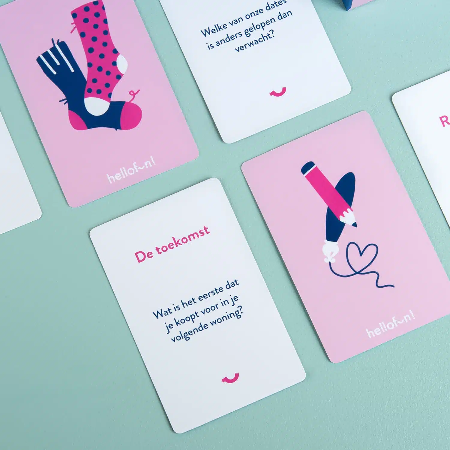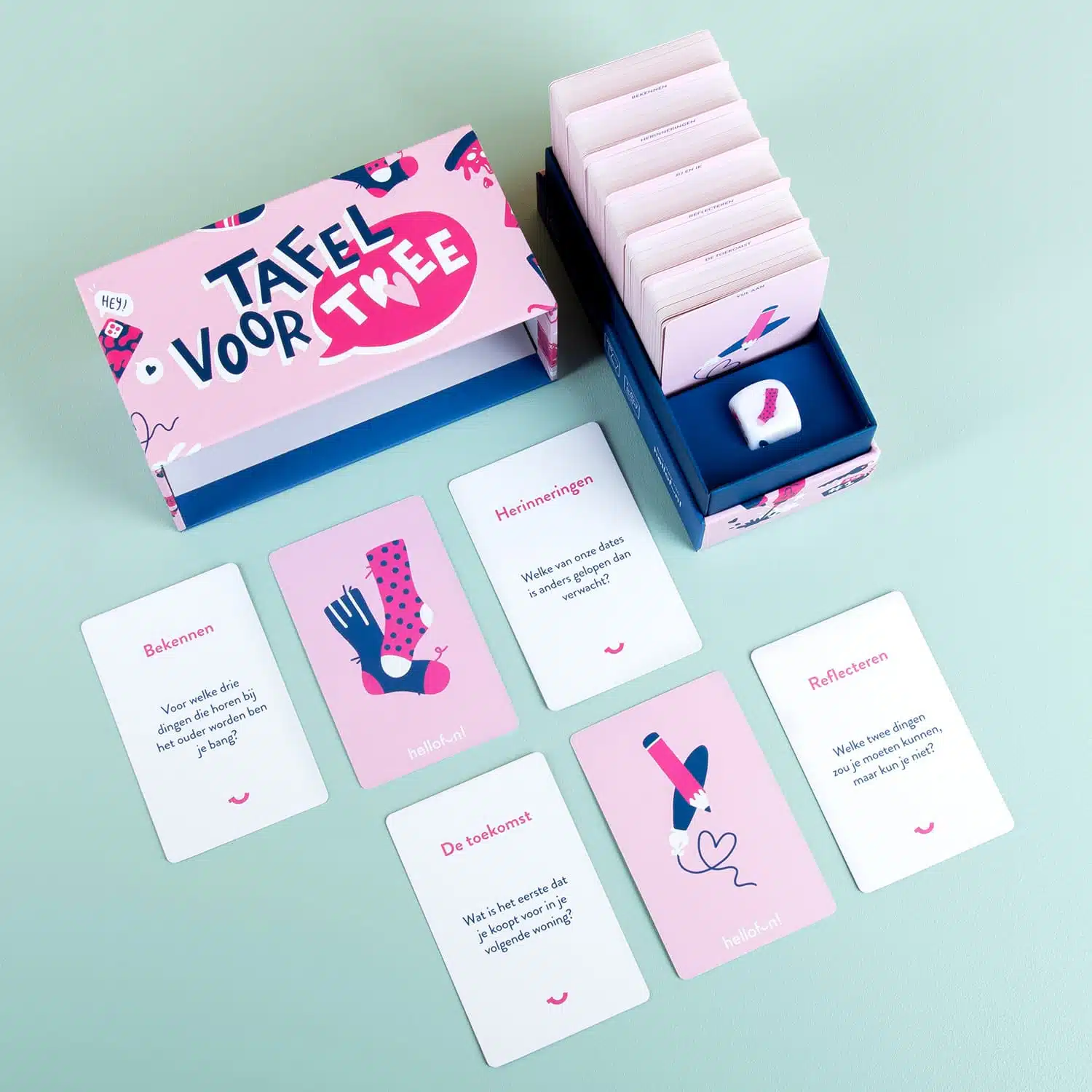 Kies dit jaar voor kerst of Valentijn iets origineels als je je partner wilt verrassen. Denk eens verder dan parfum of bloemen en geef je geliefde het Tafel voor twee spel (Nederlandse editie) van Hellofun! cadeau. Dit is een kaartenset met 200 vragen, die erop gericht zijn om je partner nog beter te leren kennen. In de set zitten vragen als: welk cadeau zou ik heel graag van jou krijgen, maar heb ik nog nooit gekregen? En: hoe denk je dat mijn perfecte dag eruitziet?