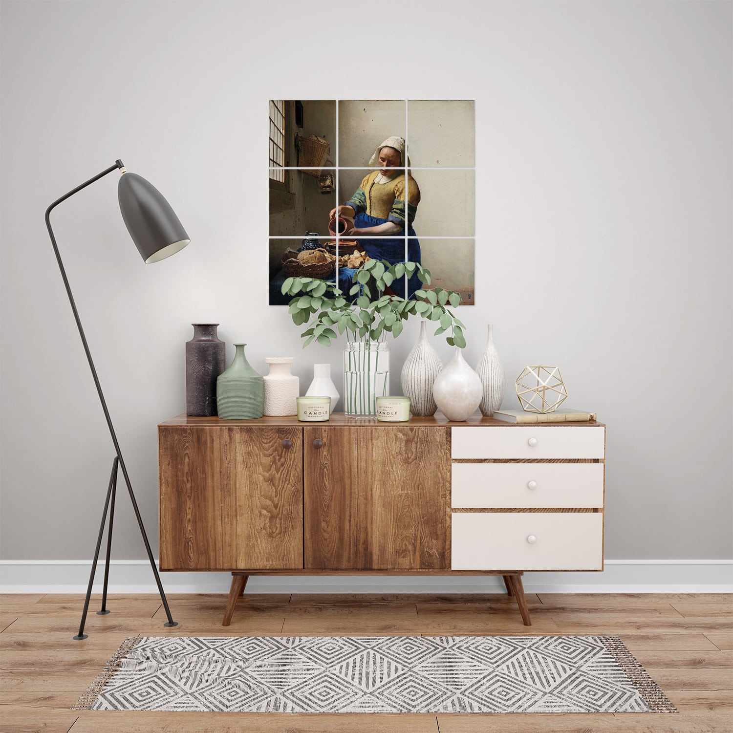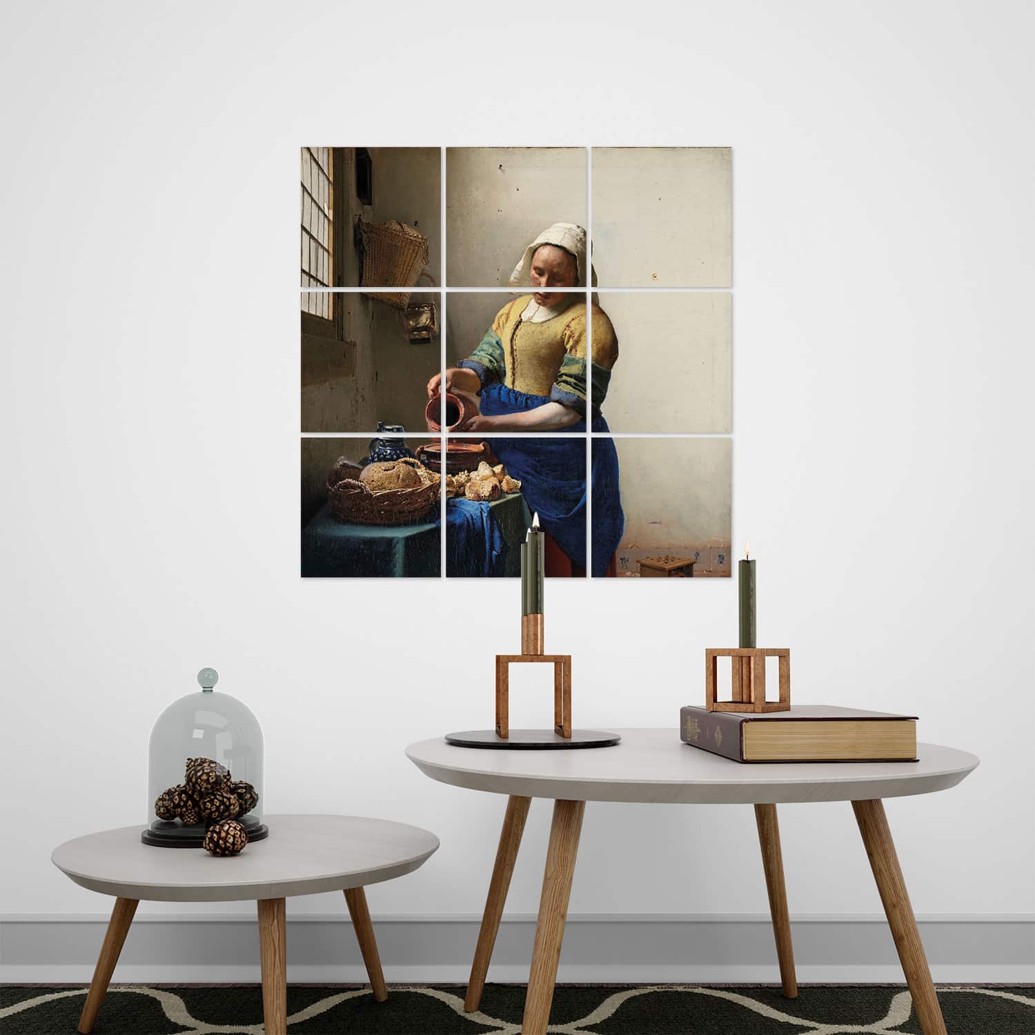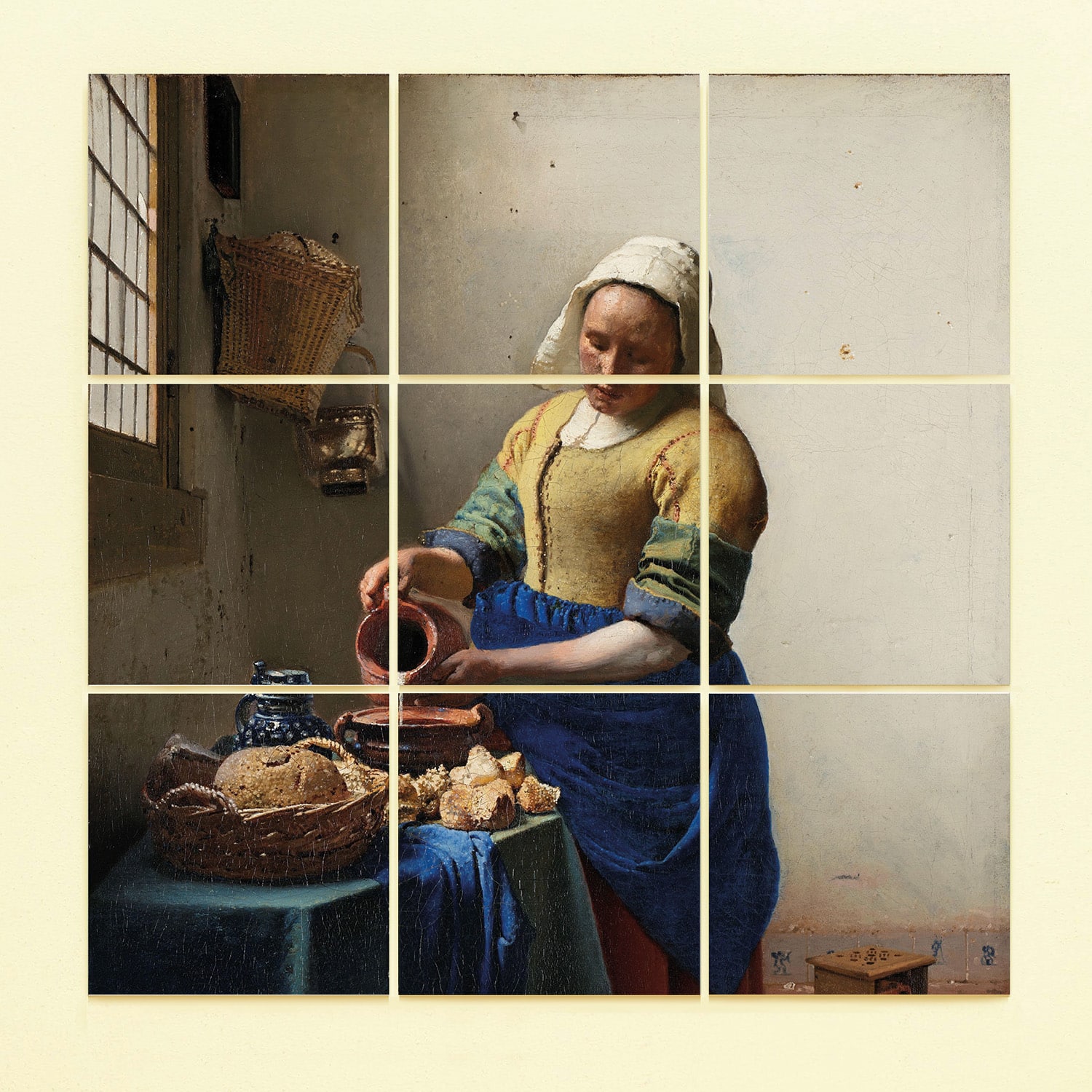 Set van negen tegeltjes met daarop het melkmeisje van Johannes Vermeer. Een tegeltableau met één van de beroemdste Nederlandse schilderijen voor aan de muur.