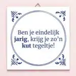 - Met de tekst: Ben je eindelijk jarig, krijg je zo’n kut tegeltje!
