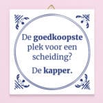 Het Tegeltje De goedkoopste plek voor een scheiding is voor iedereen die weleens gefrustreerd raakt in een relatie. Een hilarisch tegeltje met de tekst: De goedkoopste plek voor een scheiding? De kapper. Grappig voor mensen die net weer single zijn, voor in de kapsalon of op een advocatenkantoor.