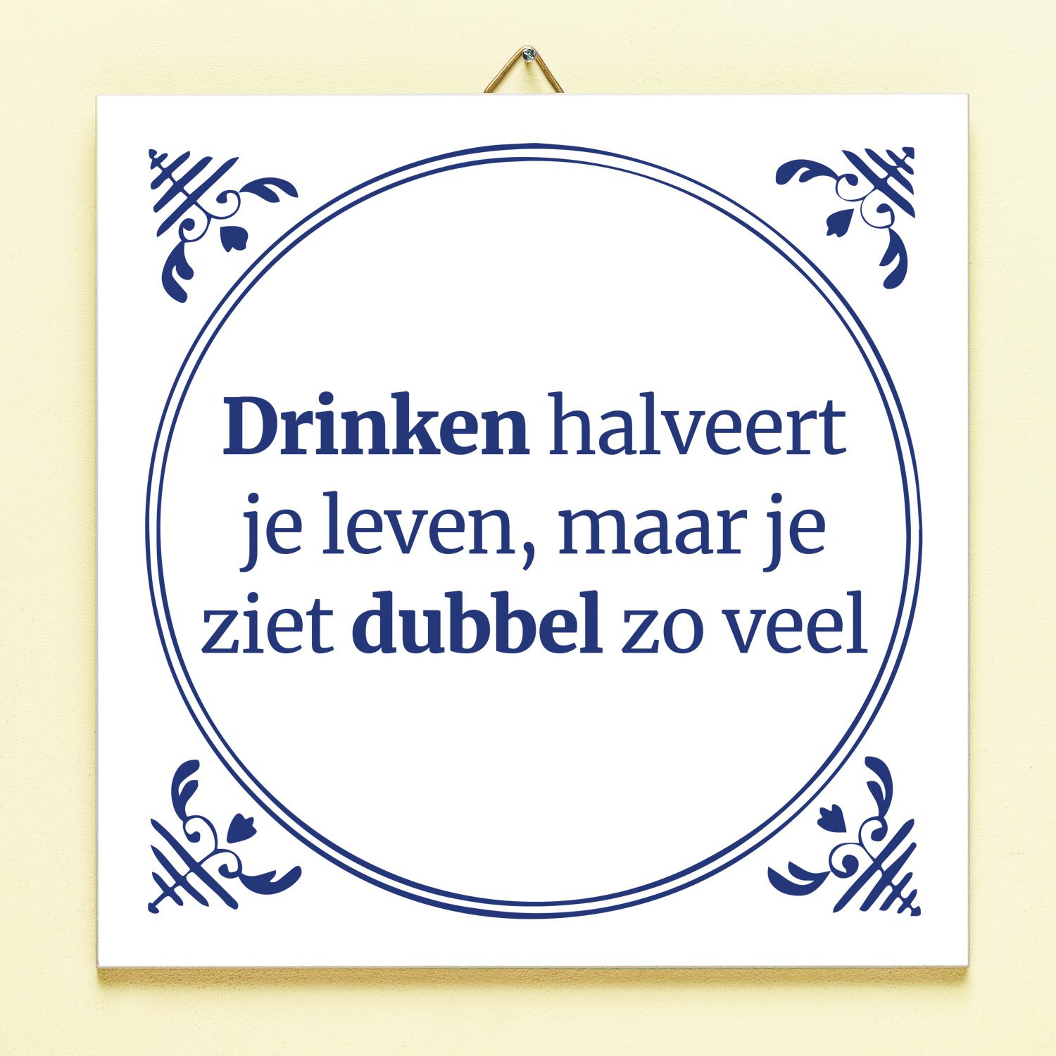 Als je te veel drinkt dan kan dat serieuze gezondheidsproblemen opleveren. Maar je zou geen echte drinker zijn als je dat niet op een positieve manier weet om te draaien. Het Tegeltje Drinken halveert je leven is dan ook perfect voor iedereen die graag een drankje te veel drinkt. Op dit grappige tegeltje – perfect voor in je thuisbar of voor aan de keukenmuur – staat de tekst: Drinken halveert je leven, maar je ziet dubbel zoveel.