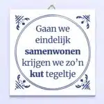 Je ouders hebben er jaren over gezeurd: kom toch eens met een leuke partner thuis. Nu is het eindelijk zover en ga je samenwonen. En wat denk je? Je krijgt het Tegeltje Gaan we eindelijk samenwonen… cadeau. Een op Delfts blauw geïnspireerde tegel met de tekst: Gaan we eindelijk samenwonen, krijgen we zo’n kut tegeltje. Bedankt, pa en ma!