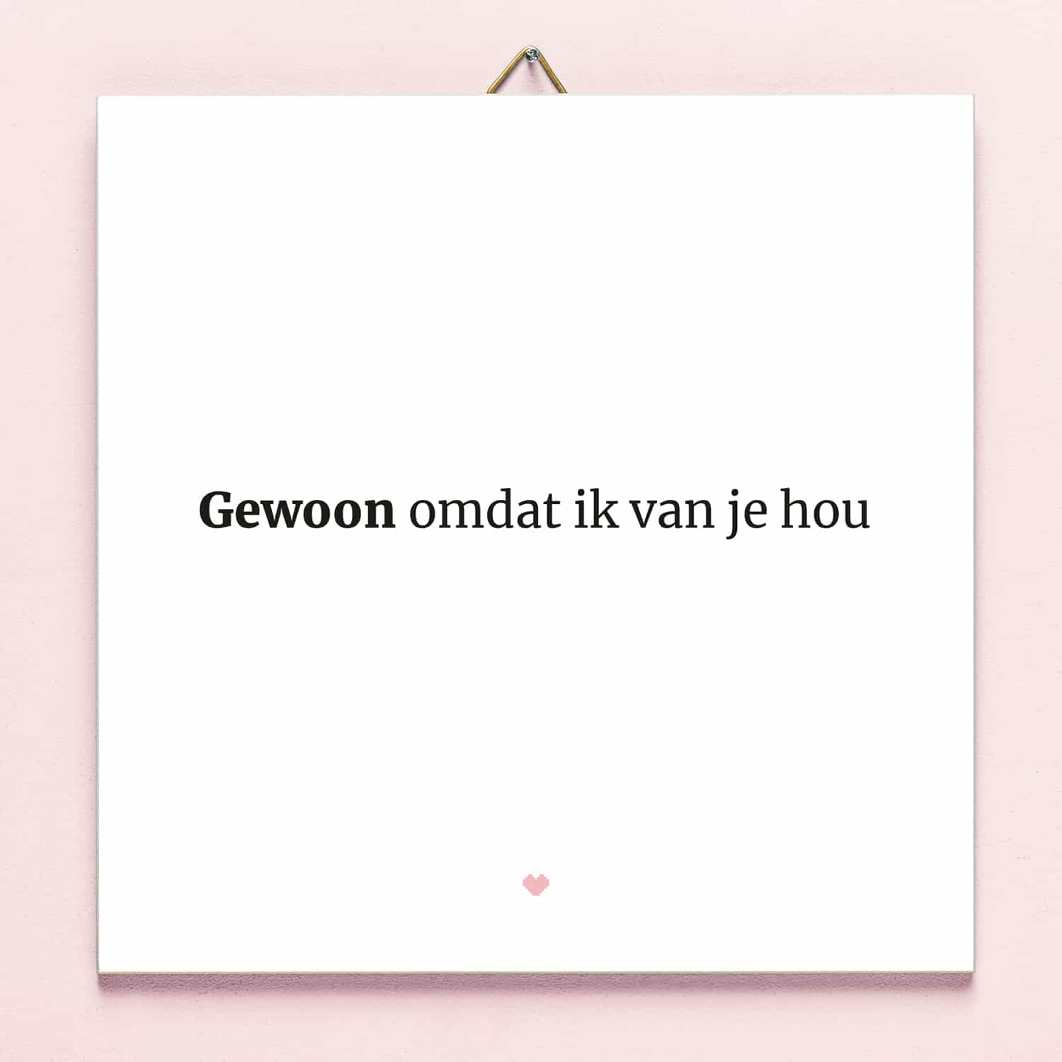 Een lief cadeautje nodig voor iemand op wie jij stapelgek bent? Het Tegeltje Gewoon omdat ik van je hou laat precies zien waarom jij het aan de ander geeft: gewoon omdat je van diegene houdt. Het tegeltje hang je bijvoorbeeld aan de muur in de slaapkamer, het toilet of op een andere mooie plek in huis. Leuk als Valentijnscadeautje of gewoon zomaar.