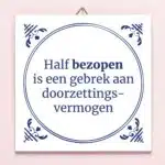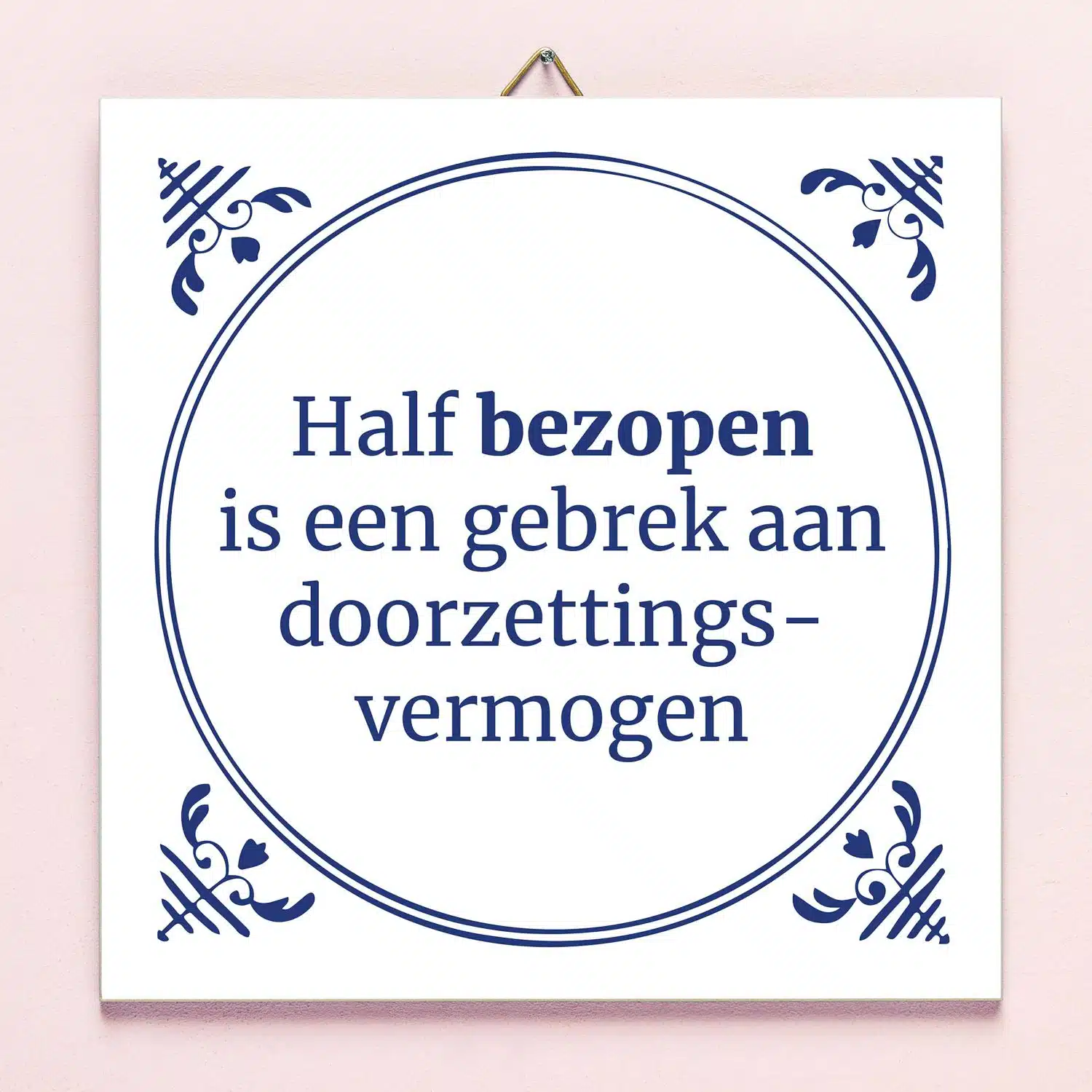 Er zijn altijd mensen die tot het gaatje gaan en jou proberen te overtuigen om dat ook te doen. Maar jij hebt geen aanmoediging nodig! Met het Tegeltje Half bezopen weet iedereen dat jij geen gebrek aan doorzettingsvermogen hebt en gaat voor volledig dronkenschap. Op het door Delfts blauw geïnspireerde tegeltje staat de tekst: Half bezopen is een gebrek aan doorzettingsvermogen. Perfect voor in je studentenkamer, vriendenkeet of gewoon aan de muur in je woonkamer. De tegel komt met een tegelhaakje, zodat hij ook opgehangen kan worden.