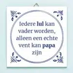 Jouw vader is geweldig. Hij is lief, sterk, staat voor je klaar. Je zou hem niet willen missen. Het Tegeltje Iedere lul kan vader worden is een cadeau met een compliment en een knipoog naar je vader. Op deze Delfts blauw ogende tegel staat de tekst: Iedere lul kan vader worden, alleen een echte vent kan papa zijn.