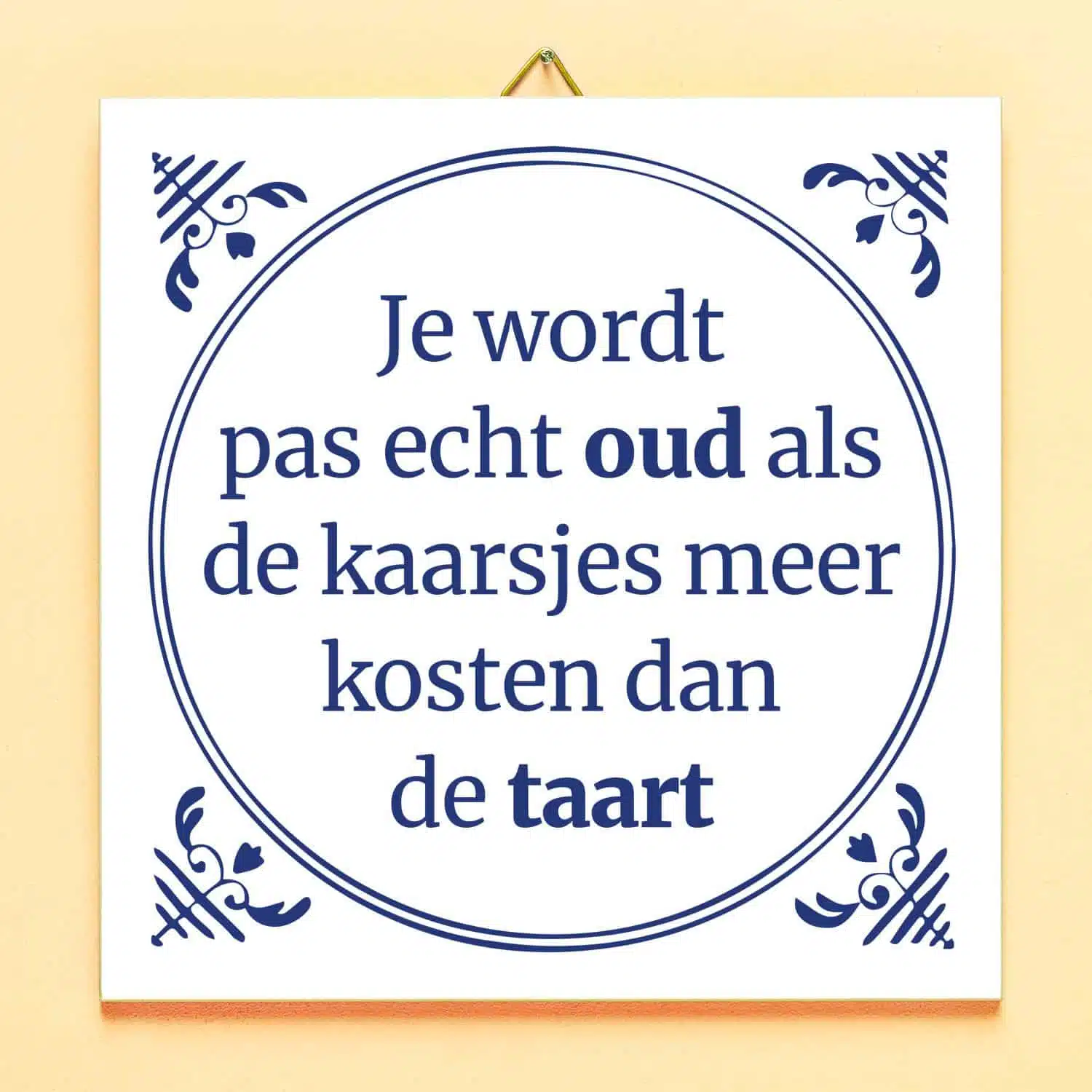 Hoe oud je ook wordt, jij viert je verjaardag goed. En dat betekent dus dat er evenveel kaarsjes op je taart horen te staan als je oud bent. Alleen… dat kan wel behoorlijk aantikken. Het Tegeltje Je wordt pas echt oud… springt hier op een grappige manier op in. Op het tegeltje staat de tekst: Je wordt pas echt oud als de kaarsjes meer kosten dan de taart. Wat denk jij: zal je vader of partner dit tegeltje waarderen voor zijn of haar verjaardag?