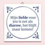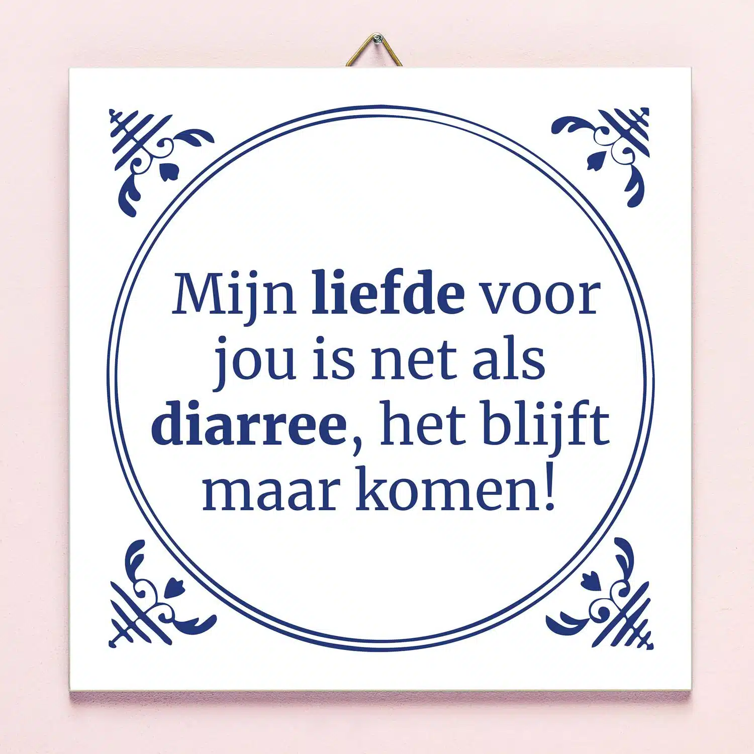 Zoek je nog een Valentijnscadeau? Of iets grappigs voor aan de muur in je toilet? Het Tegeltje Liefde is als diarree is hier perfect voor! Op het op Delfts blauw geïnspireerde tegeltje staat de tekst: Mijn liefde voor jou is net als diarree, het blijft maar komen! Niet bepaald romantisch, wel grappig. Het tegeltje komt met een tegelhaakje, zodat je hem ook op kunt hangen.