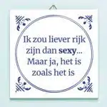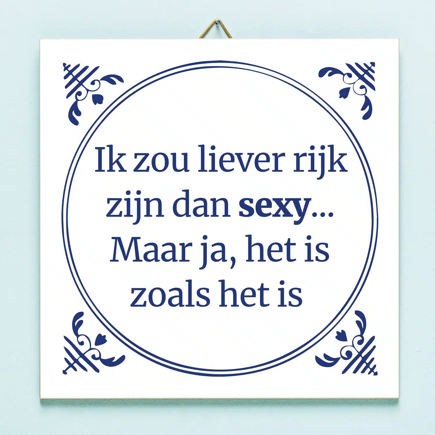 Als jij mag kiezen tussen rijk of sexy, wat kies je dan? Het Tegeltje Liever rijk dan sexy weet het wel. Op de op Delfts blauw geïnspireerde tegel staat de tekst: Ik zou liever rijk zijn dan sexy… Maar ja, het is zoals het is. Een perfect cadeau voor iemand die een groot ego heeft.
