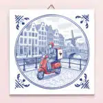 Het Tegeltje Maaltijdbezorger combineert de moderne maaltijdbezorger met klassiek Delfts blauw. Met een bezorger op een scooter door de Amsterdamse grachten, combineert dit tegeltje Nederlandse traditie met hedendaags gemak. Want oud is leuk, maar gemak is nog leuker!