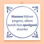 Van nieuwe PlayStations tot klassieke auto’s: mannen blijven graag spelen met mooie dingen. Het Tegeltje Mannen blijven jongens is een grappig cadeau voor je vriend, broer of vader. Met de tekst: Mannen blijven jongens, alleen wordt hun speelgoed duurder.