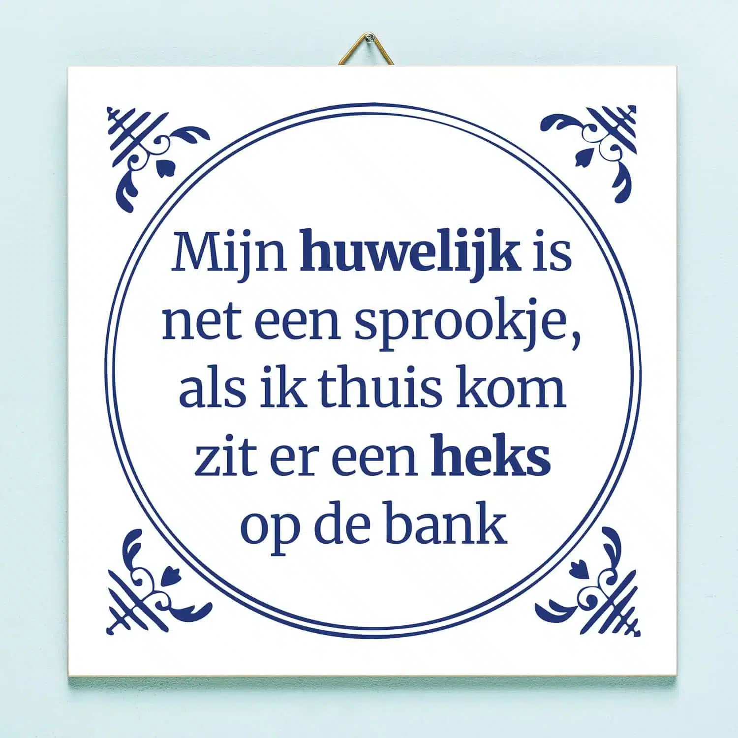 Wil je snel van je vrouw af? Geef haar dan het Tegeltje Mijn huwelijk is net een sprookje cadeau. Op de op Delfts blauw geïnspireerde tegel staat de tekst: Mijn huwelijk is net een sprookje, als ik thuis kom zit er een heks op de bank. Een snelle scheiding gegarandeerd.