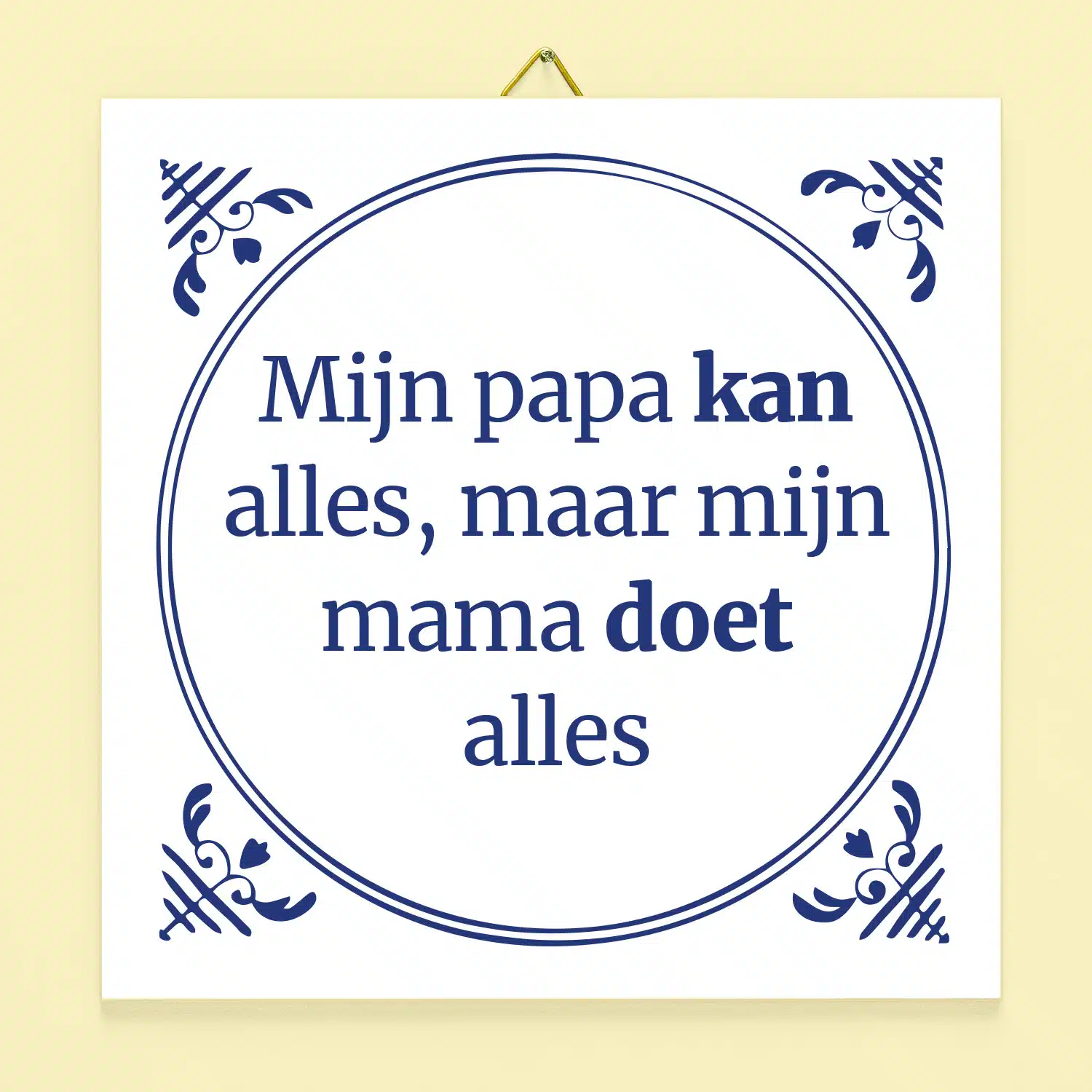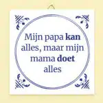 Verras je vader voor Vaderdag of zijn verjaardag met het grappige Tegeltje Mijn papa kan alles, maar mijn mama doet alles. Geschikt voor zowel Vader- als Moederdag!