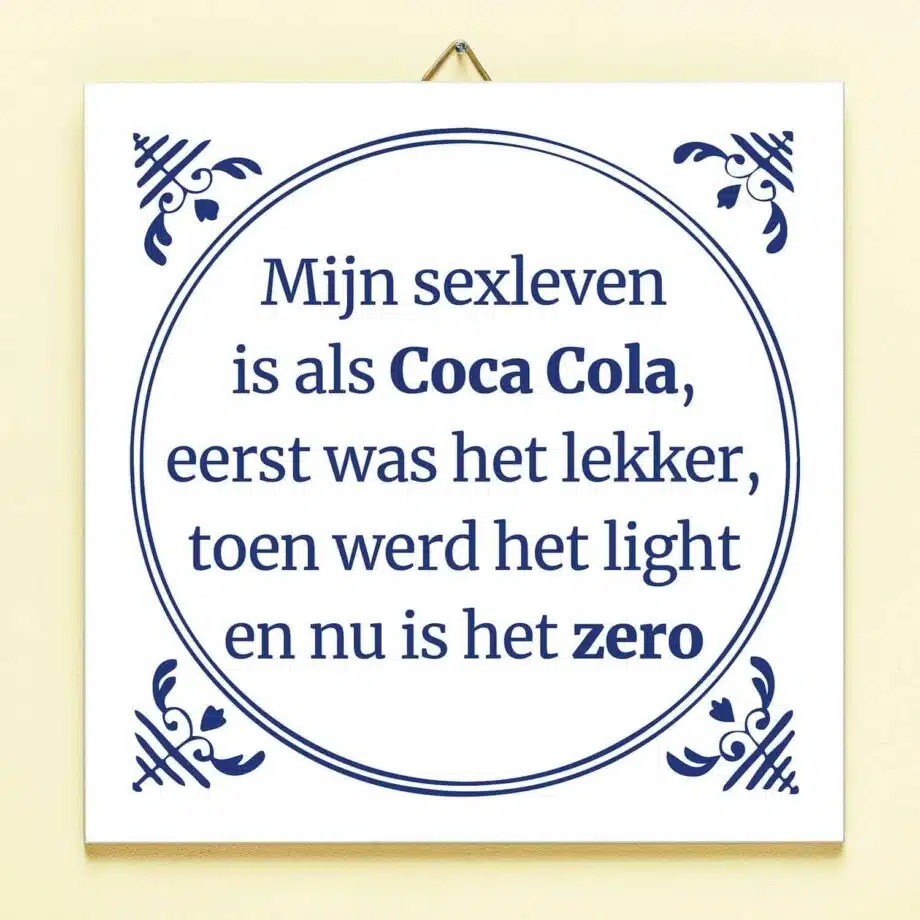 Mijn sexleven is als Coca Cola. Eerst was het lekker, toen werd het light en nu is het zero. Dat is de tekst op het Tegeltje Mijn sexleen is als Coca Cola. Dit grappige tegeltje geef je cadeau aan een vriend voor de grap, of als je echt lef hebt aan je partner. Het tegeltje is gemaakt van echt keramiek en heeft een moderne op Delfts blauw geïnspireerde look.