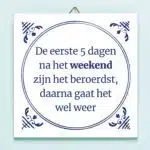 Kon het weekend maar eeuwig duren. Dan hoefde je nooit meer bij te komen! Het Tegeltje Na het weekend is er voor iedereen die alleen leeft voor het weekend. Op de tegel staat de tekst: De eerste 5 dagen na het weekend zijn het beroerdst, daarna gaat het wel weer.
