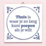 Ongestoord met je telefoon op de plee: daar voel jij je pas echt thuis. Het Tegeltje poepen hangt er natuurlijk aan de muur. Op de tegel, met op Delfts blauw geïnspireerd design, staat de tekst: Thuis is waar je zo lang kunt poepen als je wilt. Een grappig cadeautje voor mensen die veel en veel teveel tijd doorbrengen op de wc.