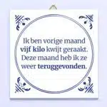 Afvallen: het is niet makkelijk. Vaak begin je vol goede moed en vliegen de eerste kilo’s eraf. Maar doorzetten is lastig en vaak zitten die kilo’s er dus ook zo weer aan. Op het Tegeltje Vijf kilo kwijt staat het mooi beschreven: Ik ben vorige maand vijf kilo kwijt geraakt. Deze maand heb ik ze weer teruggevonden. Grappig om in de keuken te hangen!