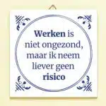 Parachutespringen, bungeejumpen, paragliden: allemaal dingen die je zonder al te veel risico kunt doen als je weet hoe het moet. Dat geldt ook voor werken. Het kan best, maar wil je het ook? Het Tegeltje Werken is niet ongezond is een grappig cadeautje voor mensen die liever niet werken. Op het tegeltje staat de tekst: Werken is niet ongezond, maar ik neem liever geen risico.